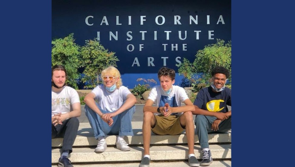 Image Description: Four young freshmen smiling and sitting on the steps in front of the “Blue Wall” at CalArts, with the school logo on the wall. From left to right: Zak, Logan, Christopher, and Malcolm.
