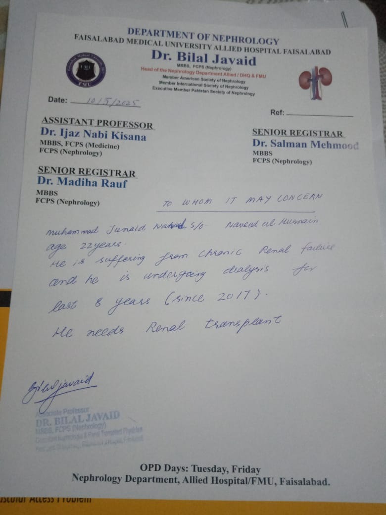 I turn to you with a humble plea, trusting in the boundless mercy of Allah (SWT) and the compassion of His Ummah. Junaid is battling a severe kidney disease and urgently needs a kidney transplant in Pakistan. He's been relying on kidney dialysis for the past 7 years. Tragically, his younger sister passed away last year in November from the same illness, leaving our family heartbroken and deeply tested in our faith.