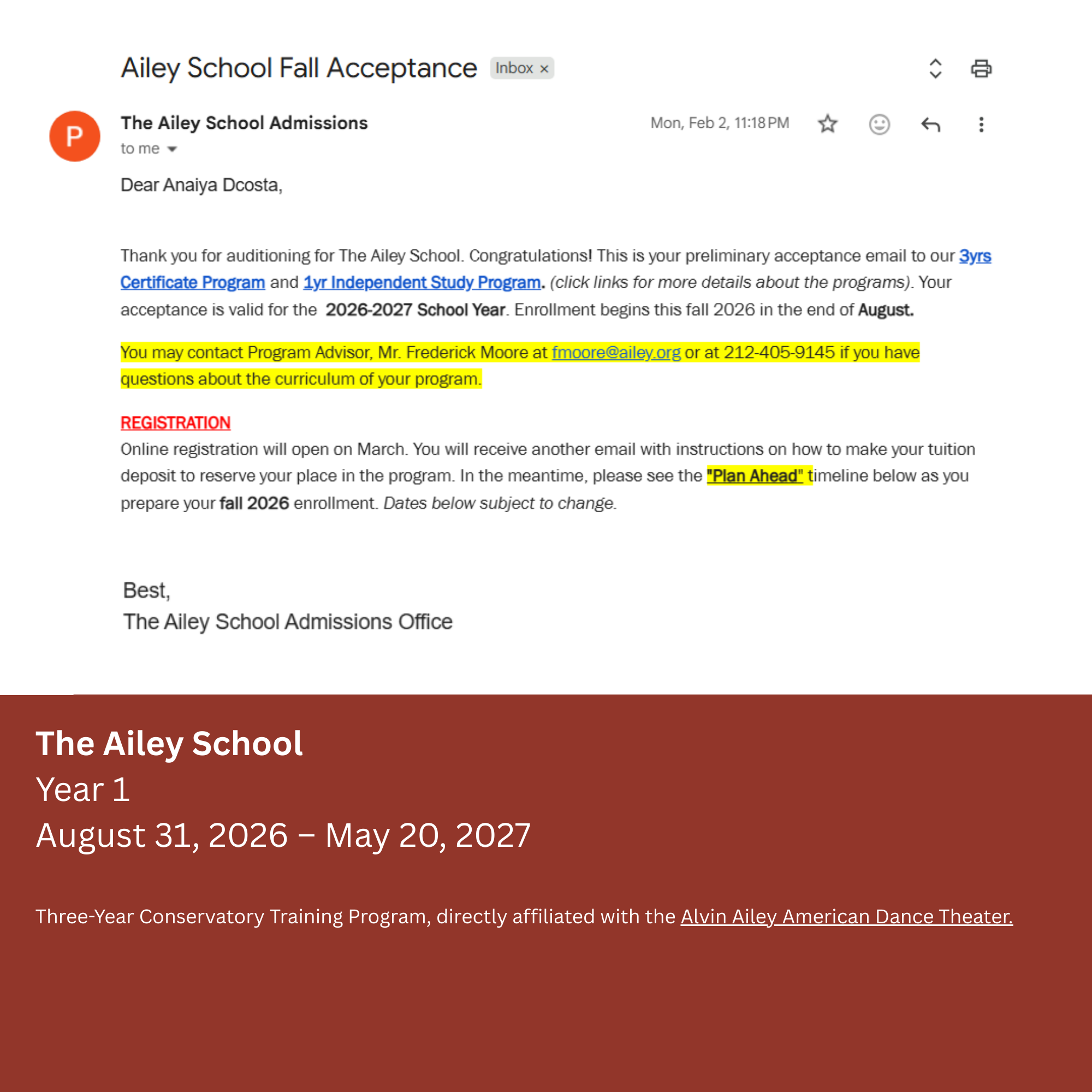 The program focuses on classical ballet and modern dance, the foundation of the Ailey artistic style, aligning best with my goal to earn a contract with the company. A direct pathway into the professional Broadway and modern dance world