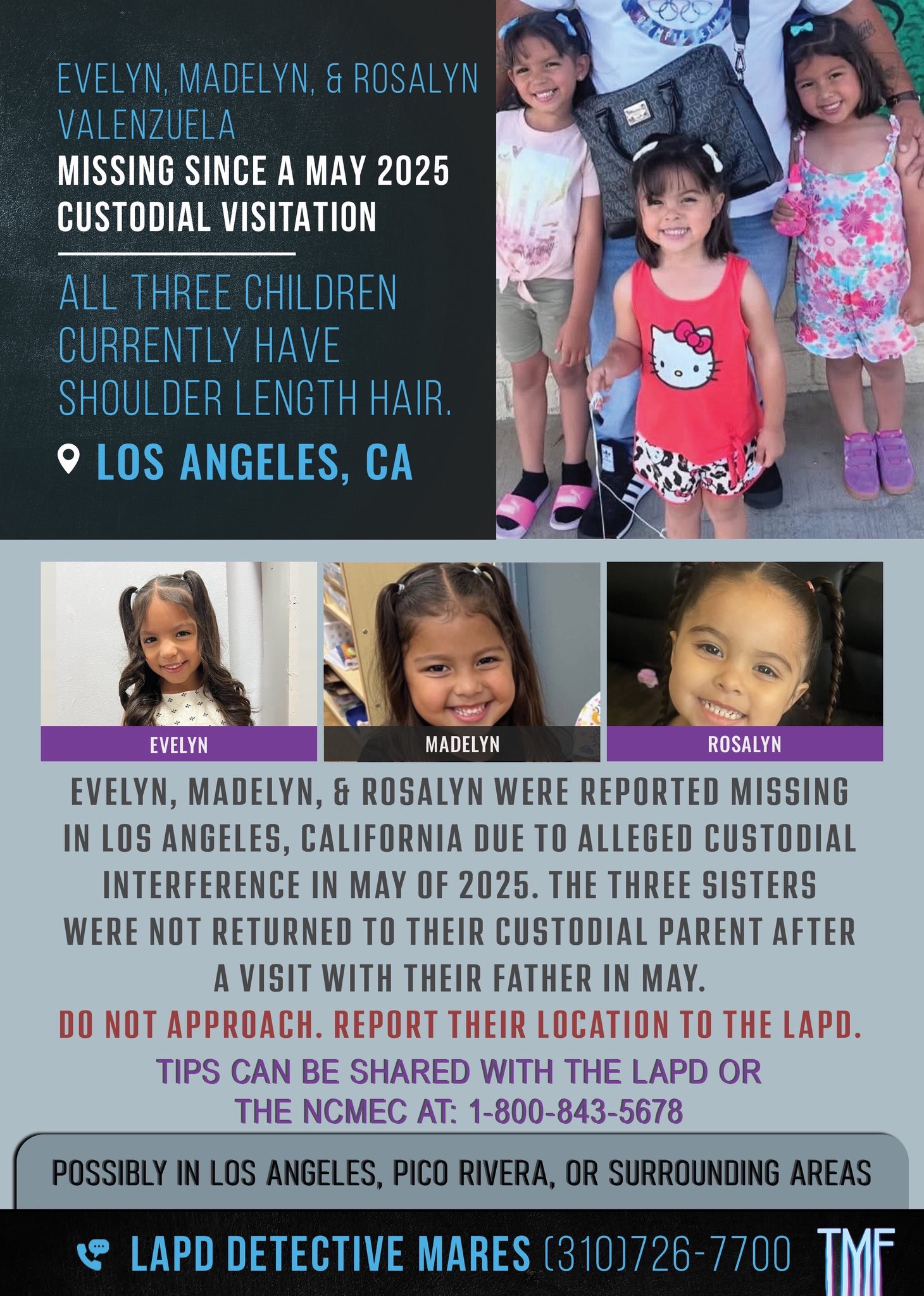 We are asking for community help in bringing attention to Angelina’s plea to be reunited with her three daughters again. She’s a mother who is yearning and aching with every fiber of her being to see and hold her girls again. She’s hurting from the trauma her ex partner and his girlfriend have put her through and is asking everyone to donate and help her to hire an attorney who can stand even stronger to help her face court soon and win her case. Her daughters too are suffering from the separation and need everyone’s help bringing them back home. Please donate and share. Every donation matters and from Angelina and family, we thank you from the bottom of our hurting hearts. No love goes unnoticed, thank you in advance. Missing daughters are Evelyn Valenzuela Age 6; Madelyn Valenzuela Age 5; Rosalyn Valenzuela Age 3.