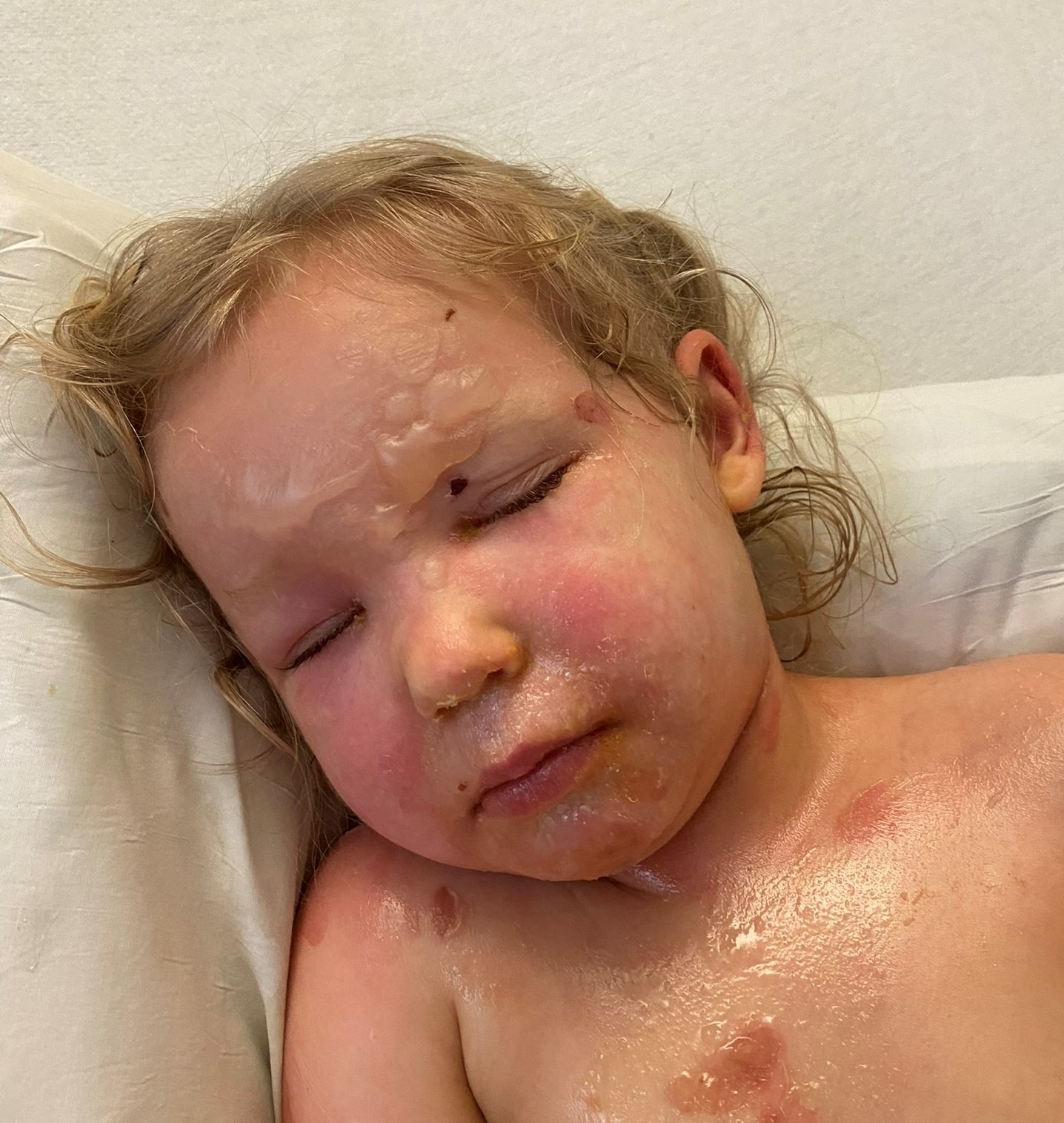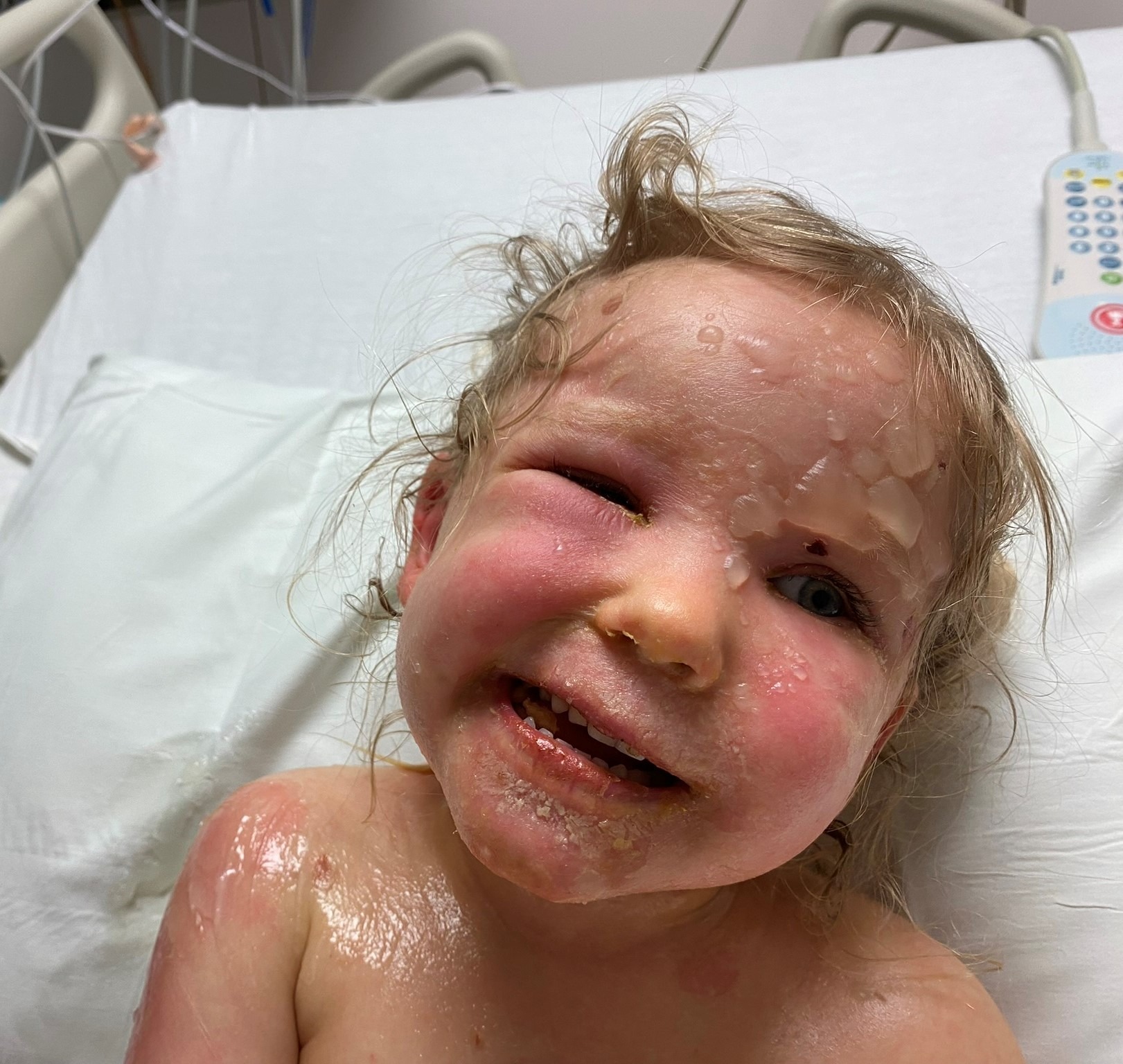 Medication has begun for the infection and wound care has been around to help with the blisters and peeling skin that continue to arise all over her small body. It is currently unknown how long it will be before she will be discharged and able to go home.