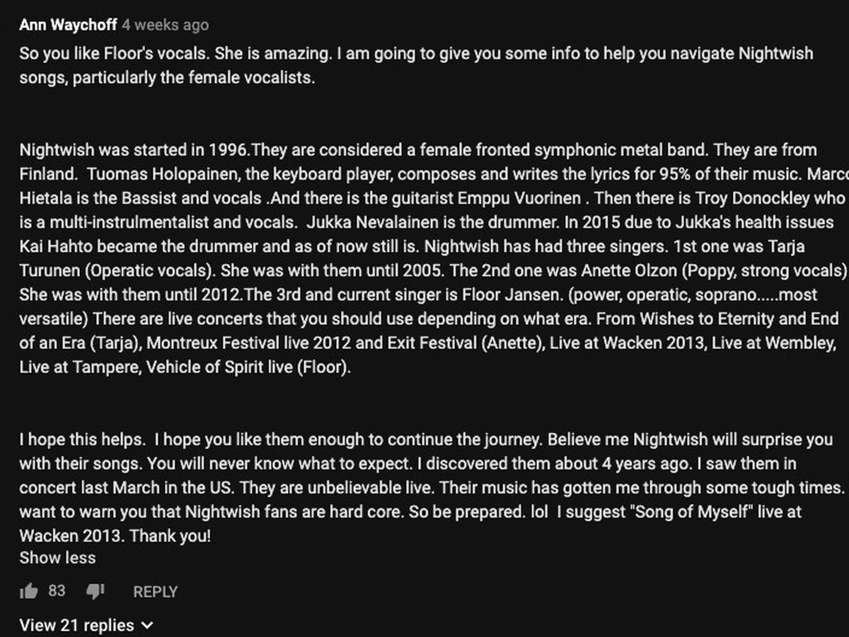 The comment section in every video is where fans gather to welcome the new fan and share in the band's story and also provide insight and suggestions for other songs to listen to. There is one fan among us that has dedicated much of her time and heart into welcoming others into the Nightwish family. That person is none other than Ann Waychoff (Way-KOFF). Her comments are always kind hearted and welcoming and she has a heart of gold as well as one of Nightwish's biggest fans among us.