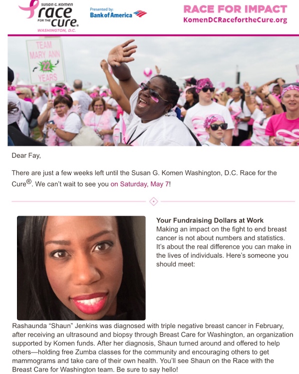 Shaun did the opening speech for Susan G. Komen Washington DC, race in May, 2016