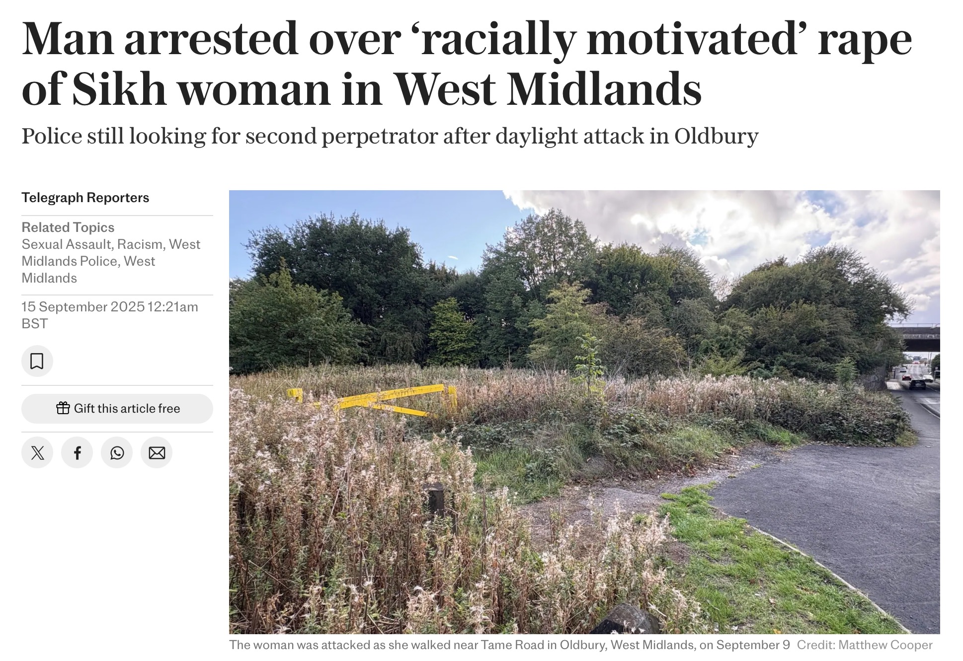 Update: Officers investigating the brutal racist sexual attack and rape in Oldbury of a Sikh woman in her 20s have this evening (Sunday 14 September) arrested a man.