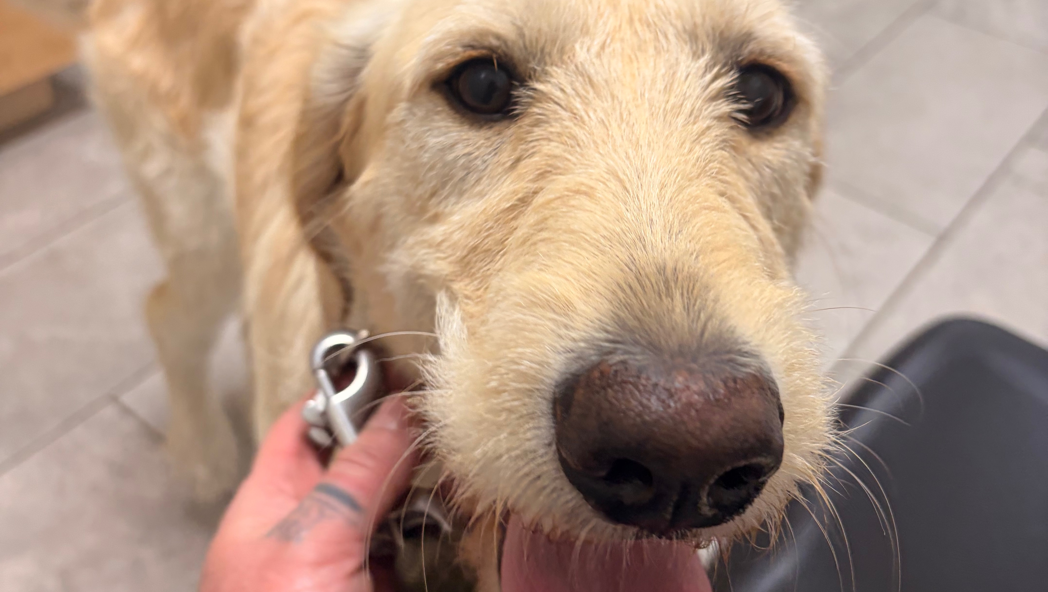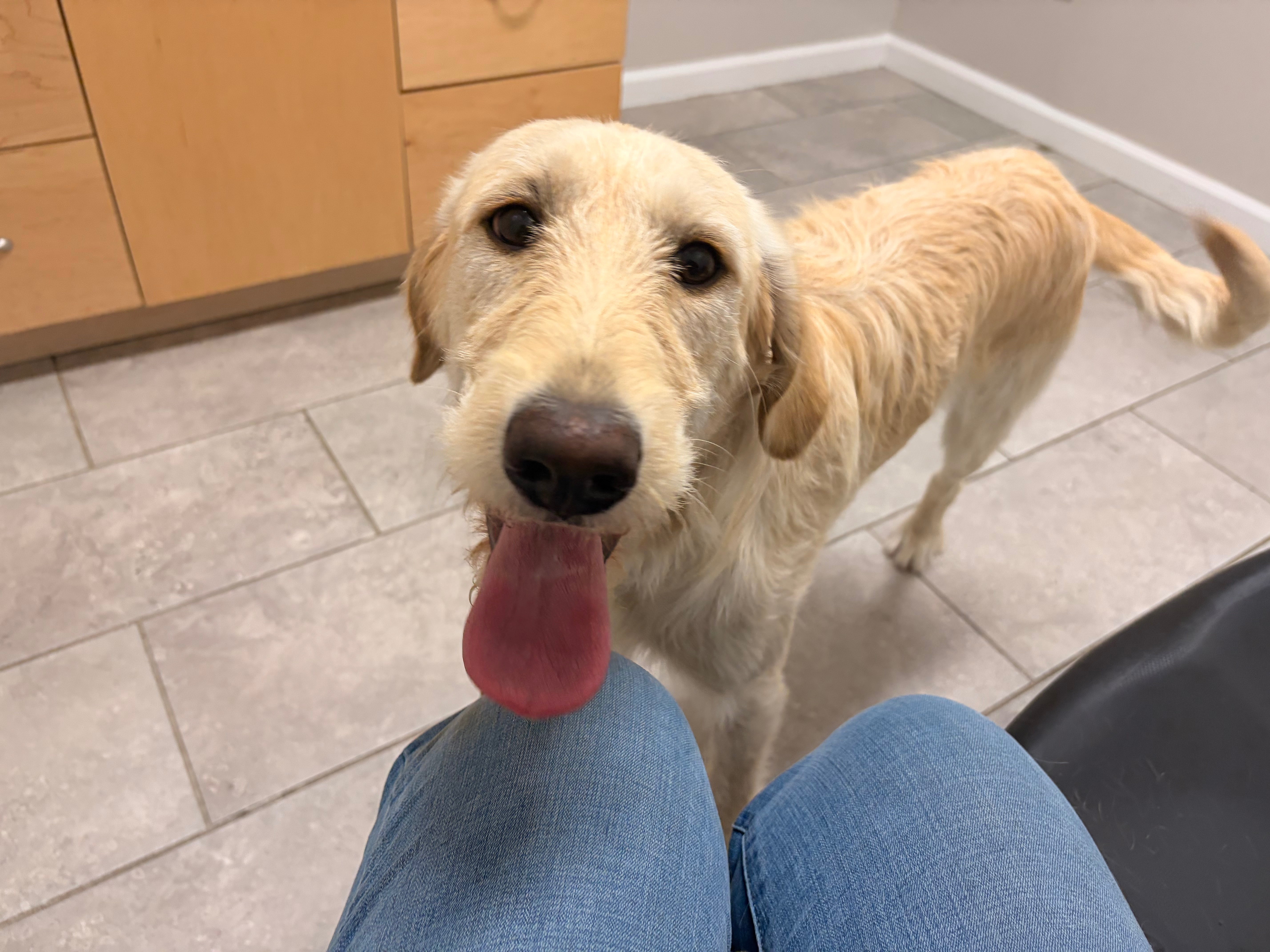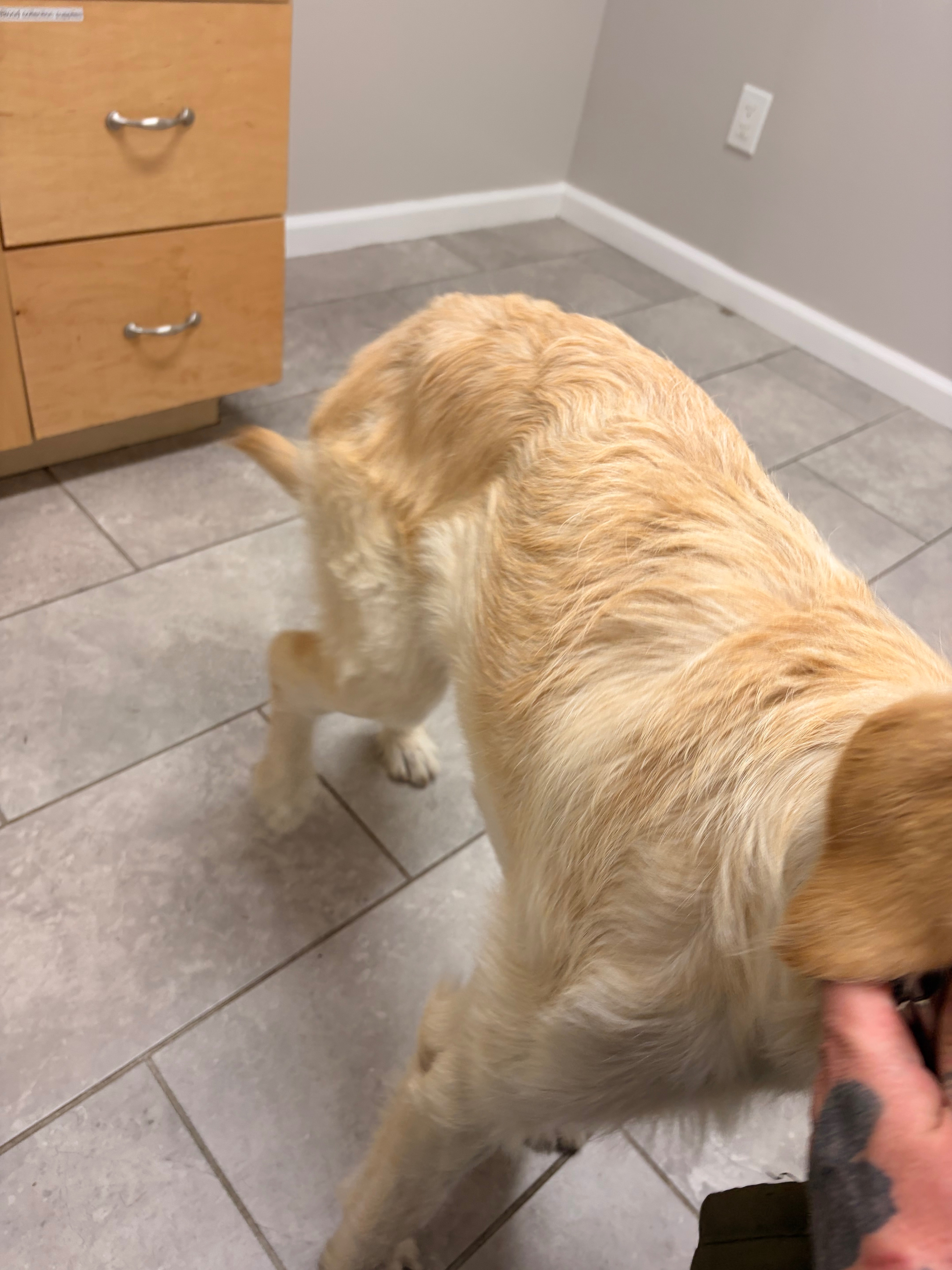 This is Kona, a one-year-old rescued Goldendoodle, and she has a broken leg.