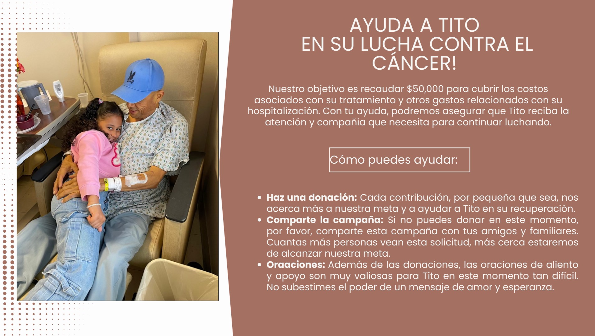 Tito es un hombre lleno de vida, amor y esperanza, que está enfrentando una de las batallas más duras de su vida. Actualmente, Tito está luchando contra un agresivo cáncer y necesita nuestro apoyo más que nunca. El tratamiento y la atención médica necesarios para salvar su vida son costosos, y su familia y amigos se han unido para hacer todo lo posible por apoyarlo, pero no pueden hacerlo solos.