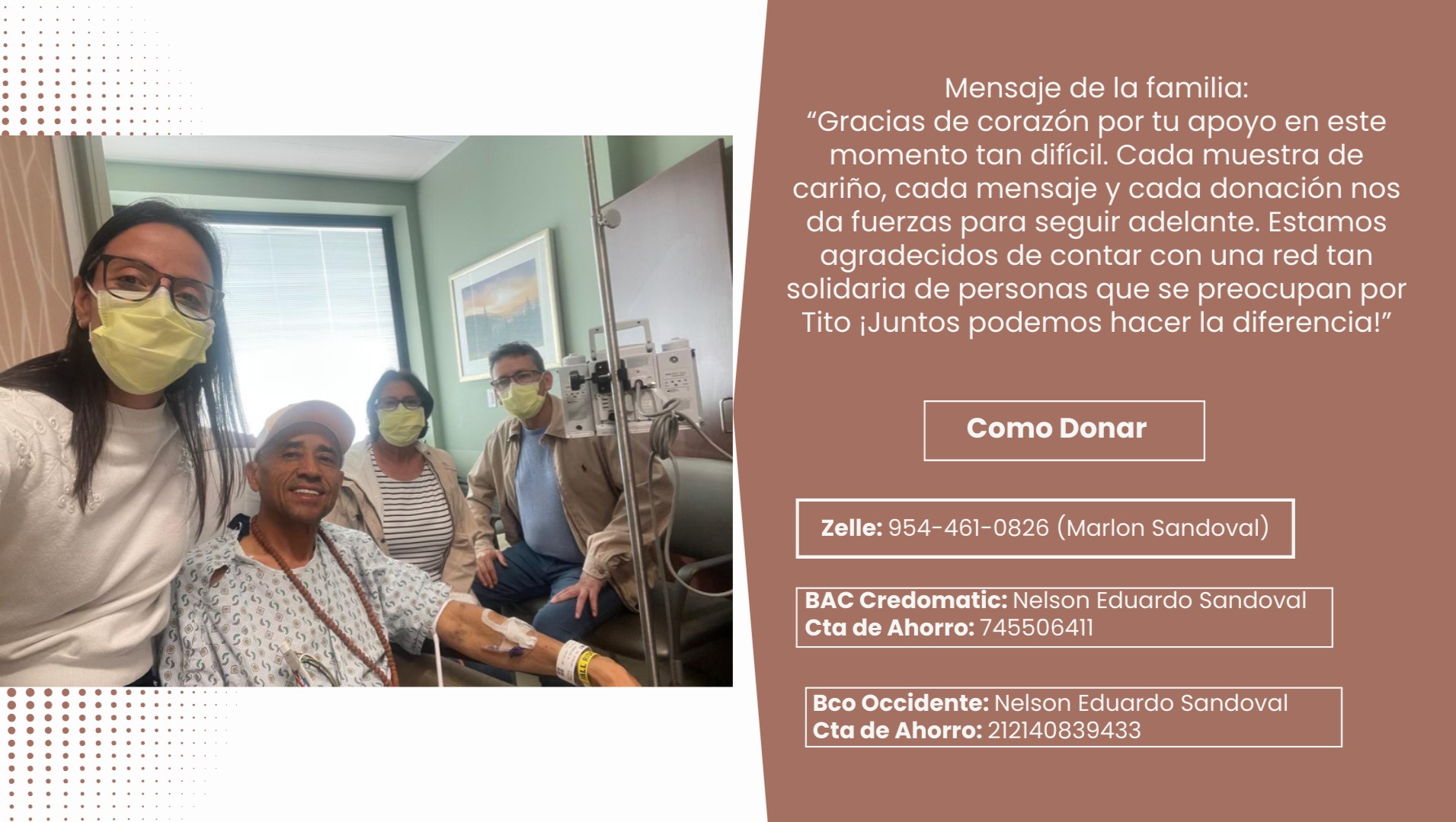 Tito en este momento nos necesita! La vida de Tito está en nuestras manos. Con tu generosidad, podemos ayudarlo a seguir luchando y a vencer esta dura enfermedad. Te agradecemos profundamente por tu apoyo, tus oraciones y tus pensamientos positivos. ¡Con tu ayuda, Tito tiene una oportunidad para superar este desafío!