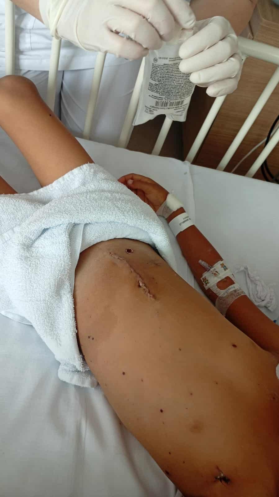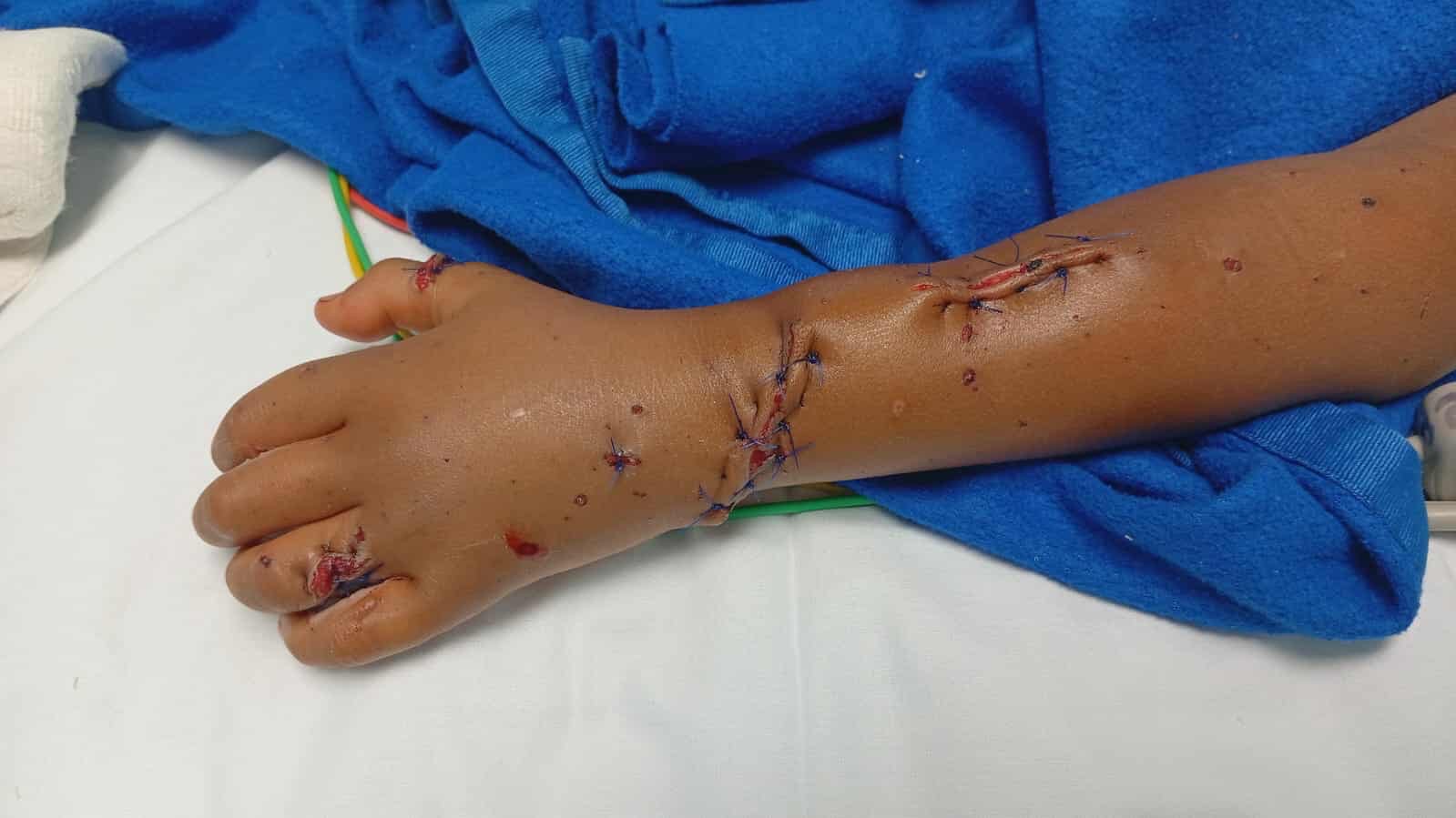 Melani de 6 años, perforación de intestino, fractura de los dedos y necesita reconstrucción de tendones.