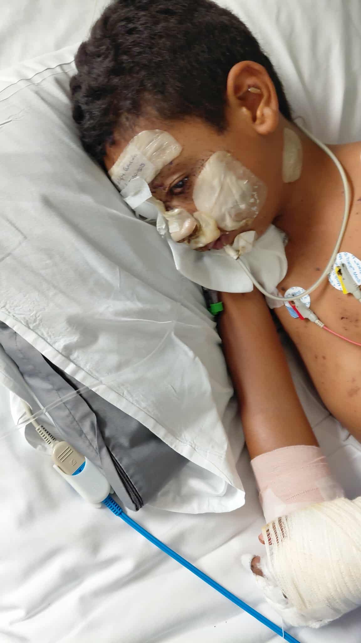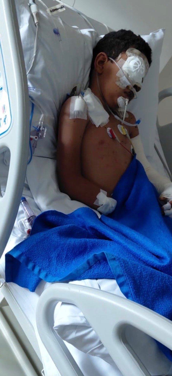 Samuel de 8 años perdió su mano derecha, su mano izquierda está llena de cortadas, todo su cuerpo está lleno de esquirlas( cara, estómago, piernas, brazo izquierdo) su ojo derecho necesita ser intervenido, porque fue afectado, y su boca necesita reconstrucción ya que su labio se destrozó en partes por el impacto de la explosión.
