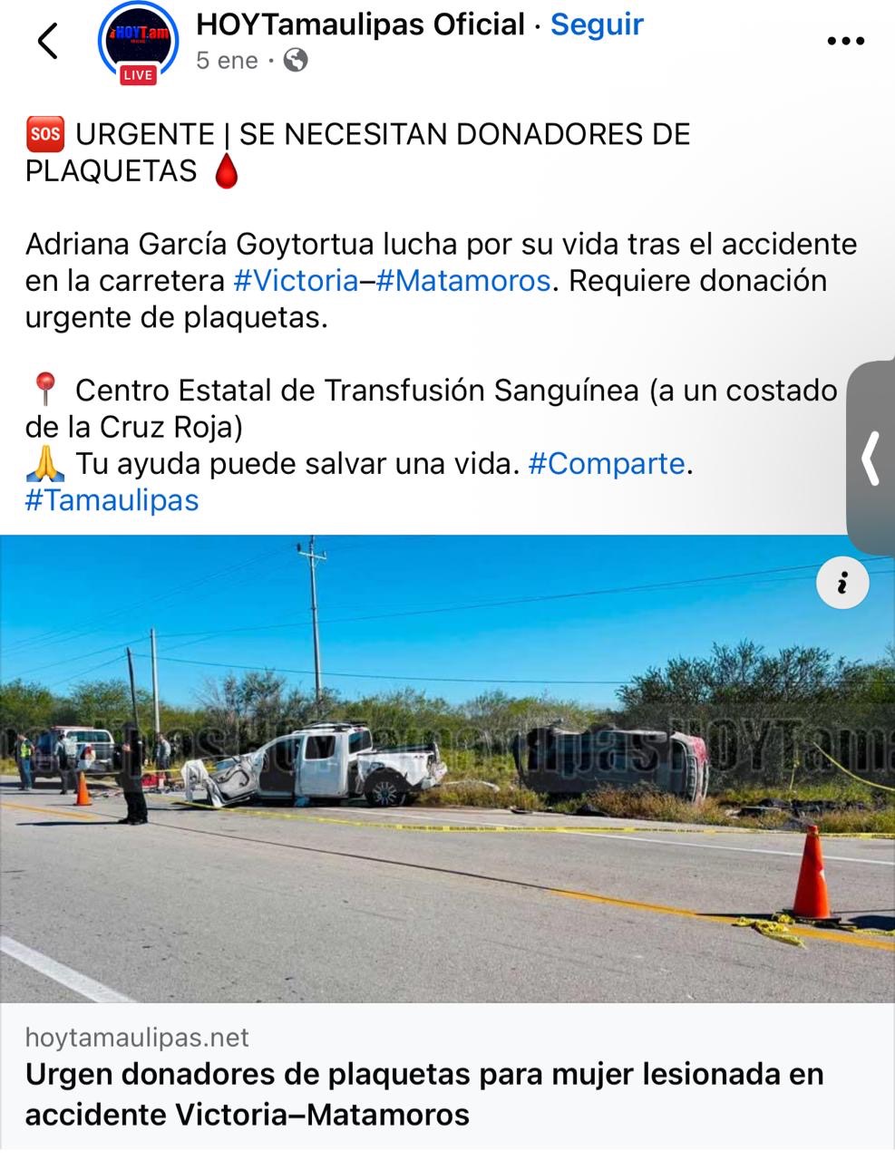 Estuvo gravemente hospitalizada en el hospital de altas especialidades de Ciudad Victoria desde el día en que ocurrió el accidente el 04 de enero.