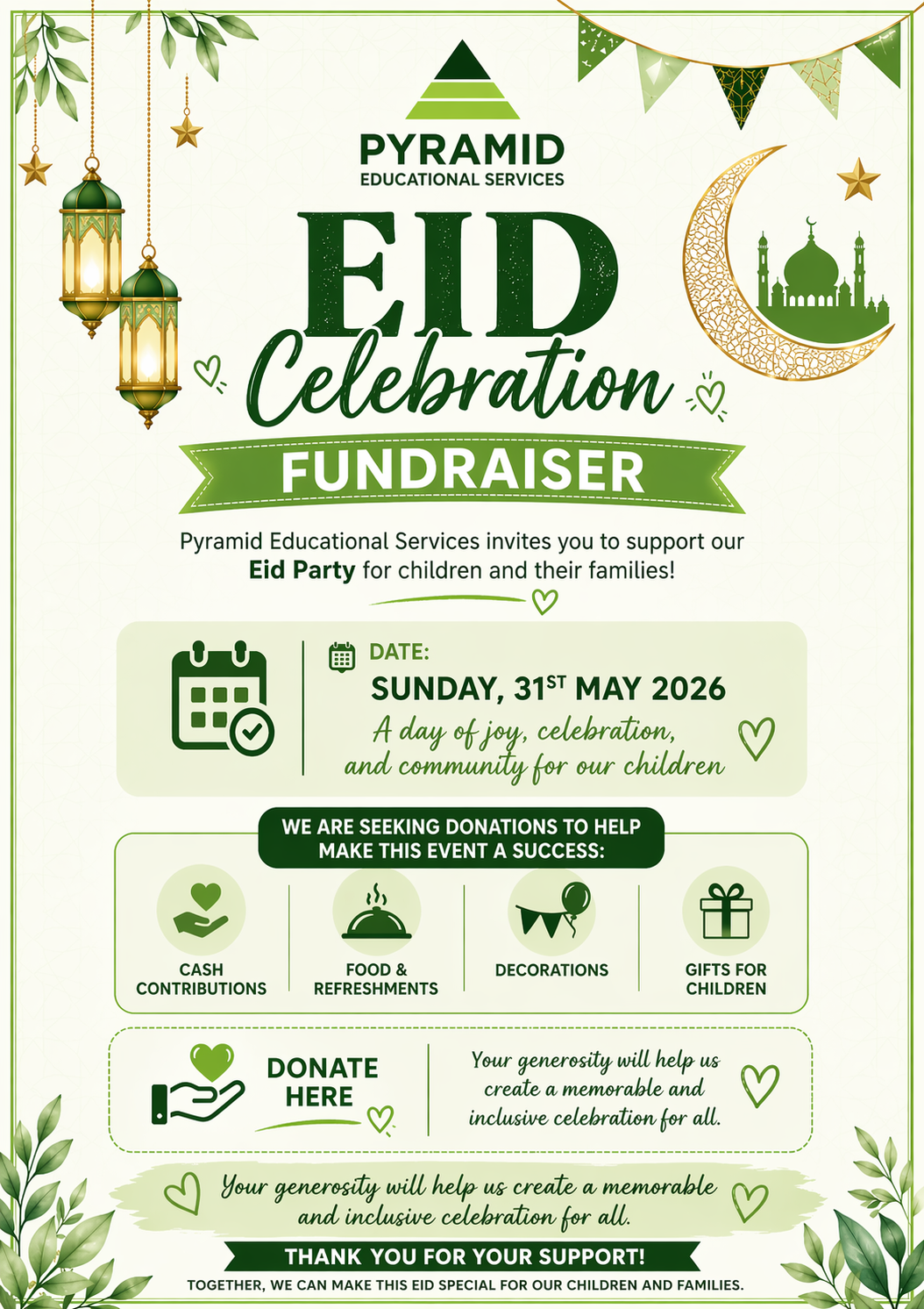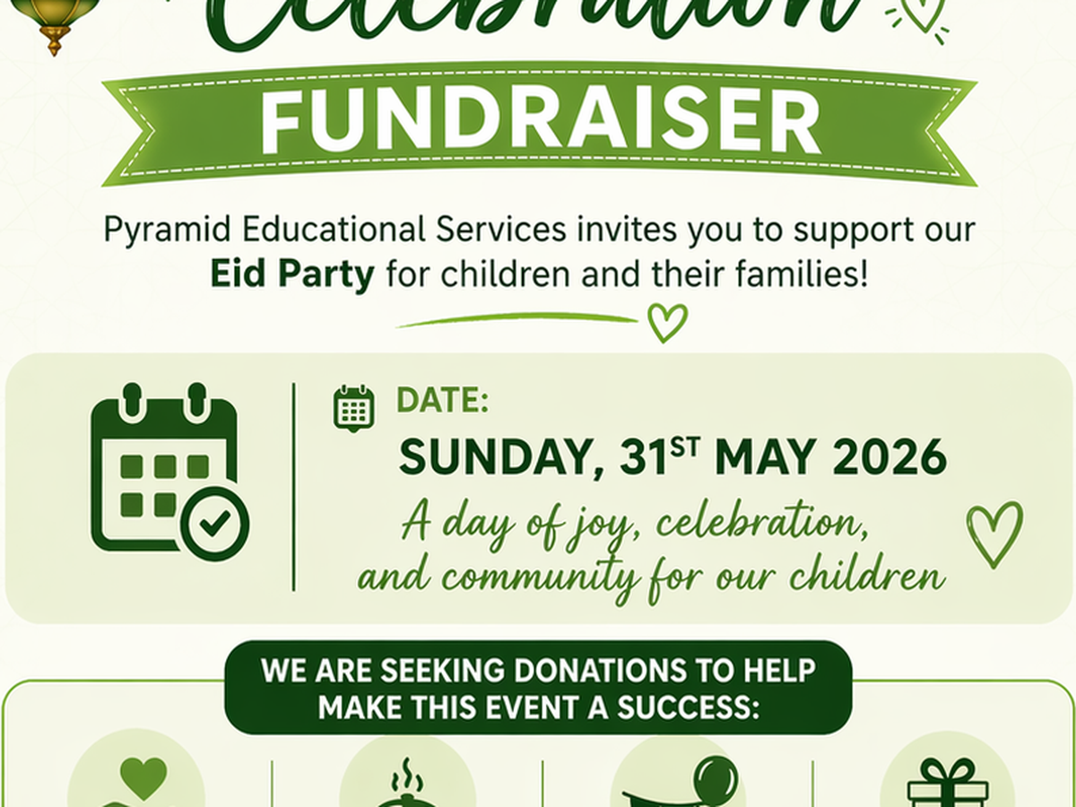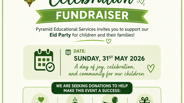 On behalf of Pyramid Educational Services, we are pleased to share that we are organising a special Eid Party for our children and their families on Sunday, 31st May 2026. This event aims to bring our community together in celebration, creating a joyful and inclusive space for children and parents to connect, celebrate, and make lasting memories.
