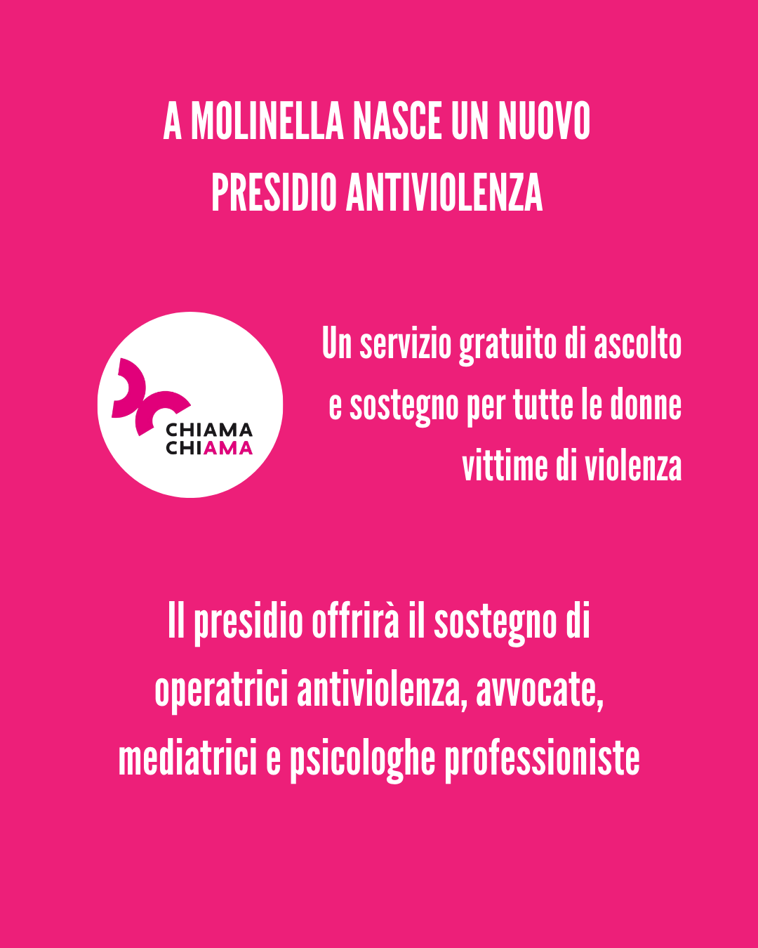 Il presidio CHIAMA chiAMA aprirà a Marzo 2026 a Molinella, sarà attivo un giorno al mese e sarà gestito dalle volontarie di MondoDonna, integrando la rete di antiviolenza già esistente.