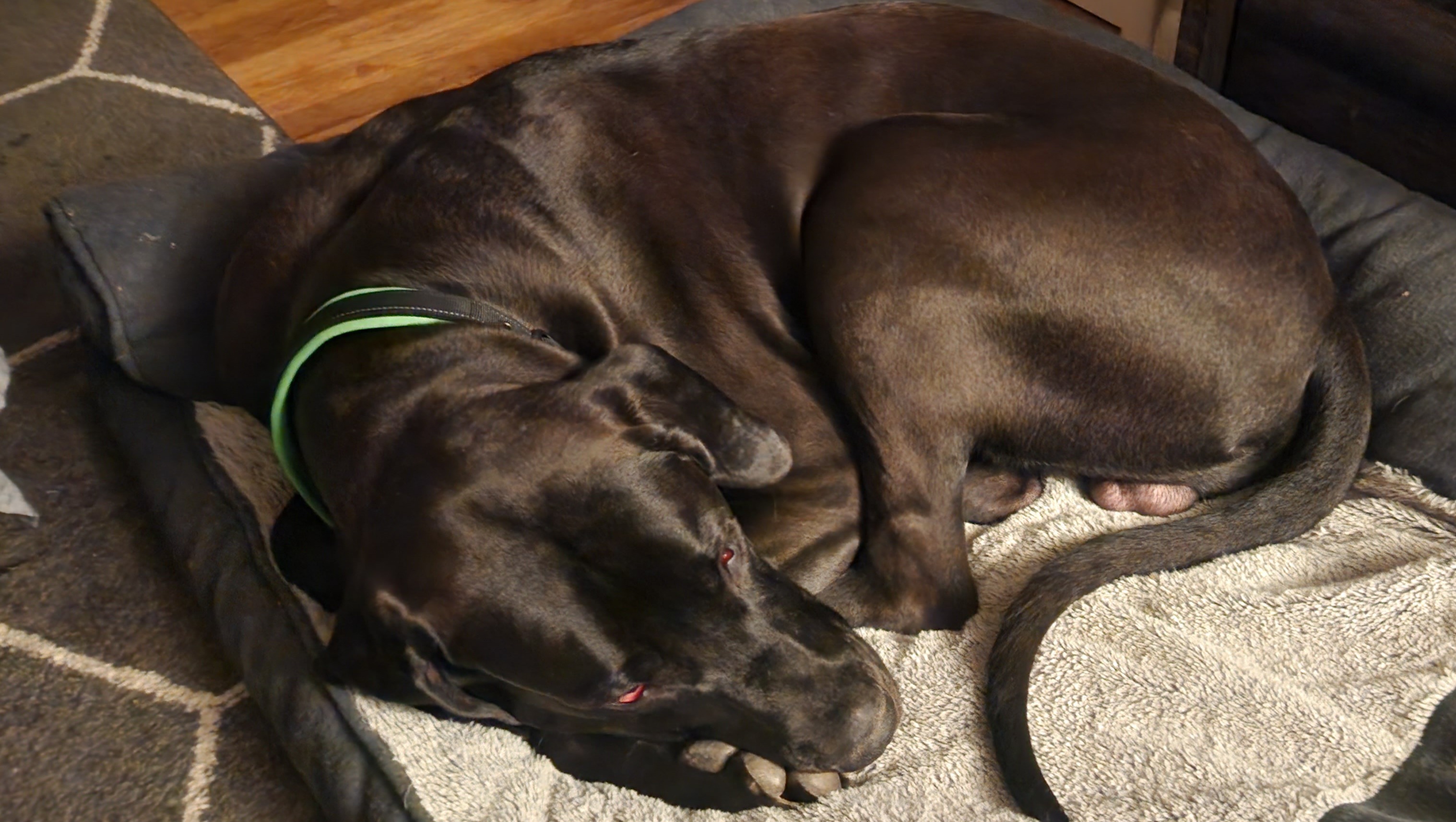 [Pictured: Arlo snuggled up in his favorite dog bed.]
