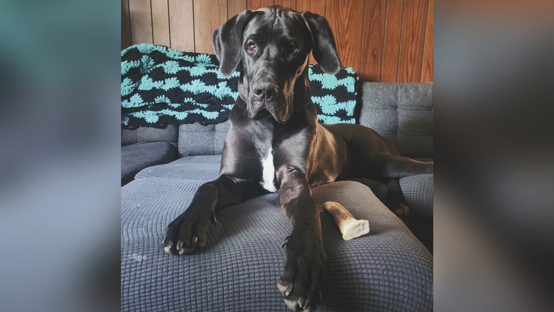 [Pictured: Arlo on the couch with his favorite bone!]