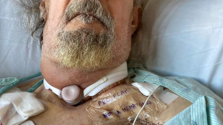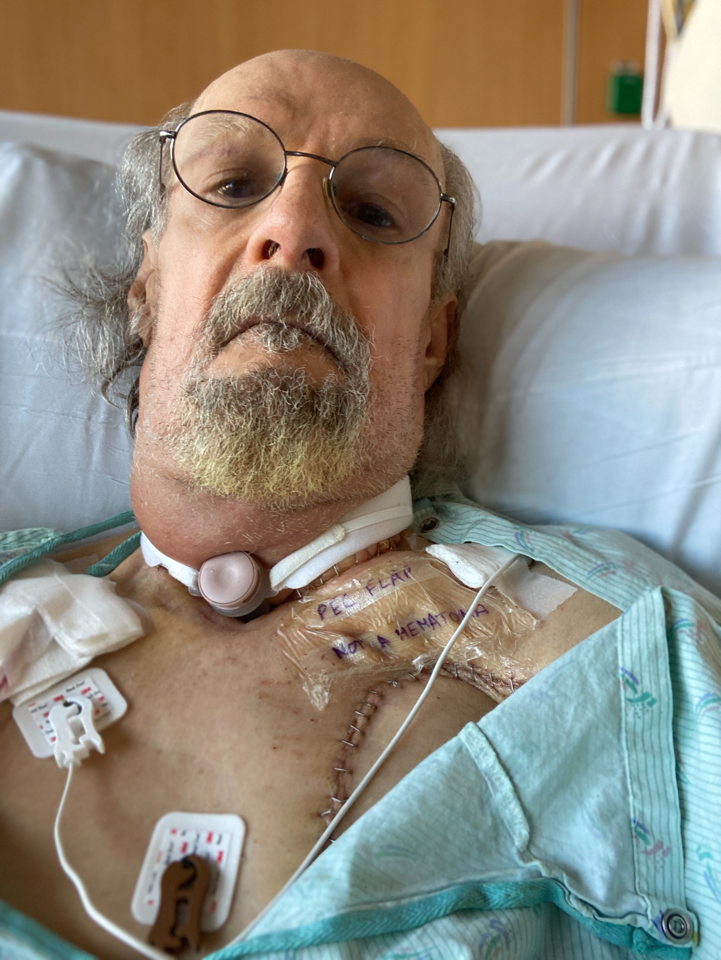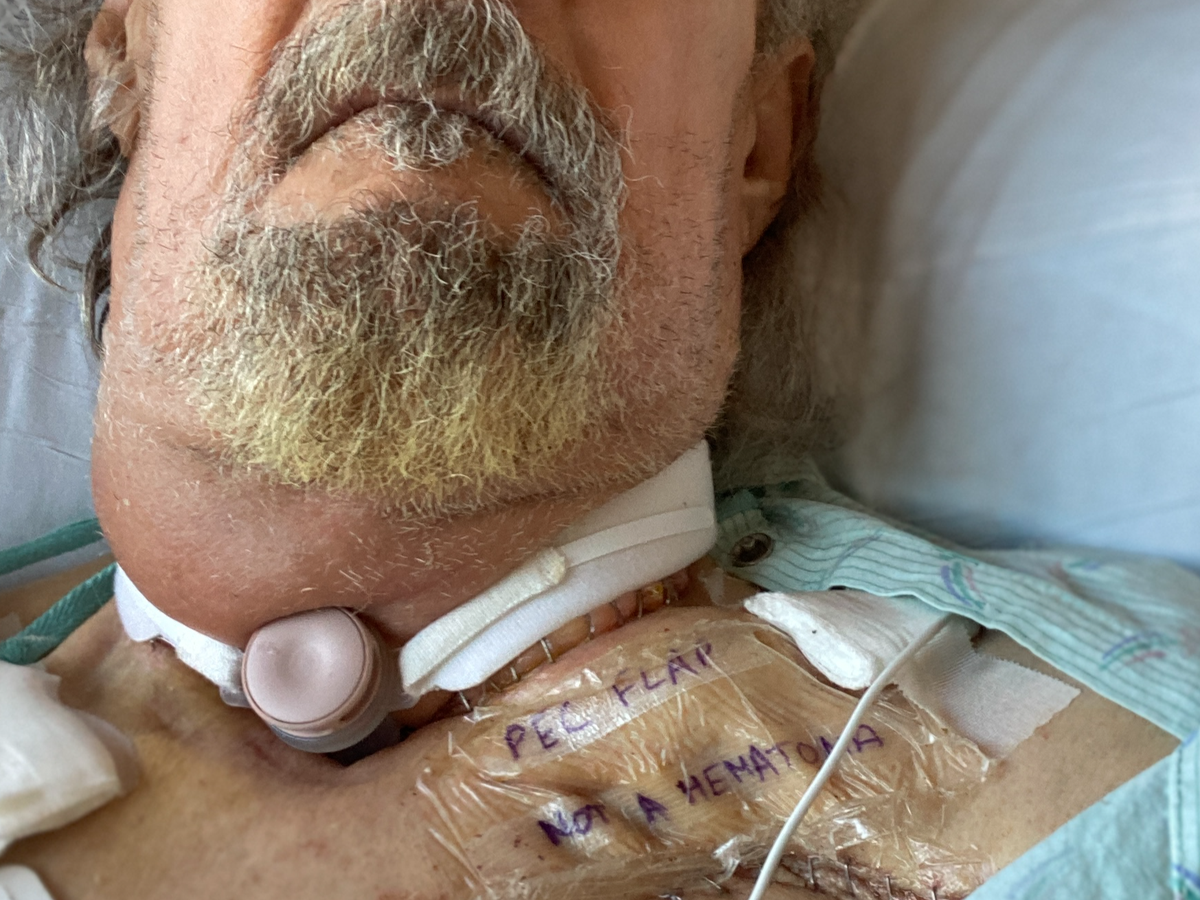 When the day came, I was in surgery for 13 hours. The surgical team, impressively skilled, saved my tongue – a horrifying prospect I truly faced. They believed they got all the cancerous tissue, but the reality is that I now have lost my voice. My throat architecture is forever altered as I became a neck breather. All connection of my nose and mouth to my lungs was terminated, so I now have no air to blow, spit, or anything.