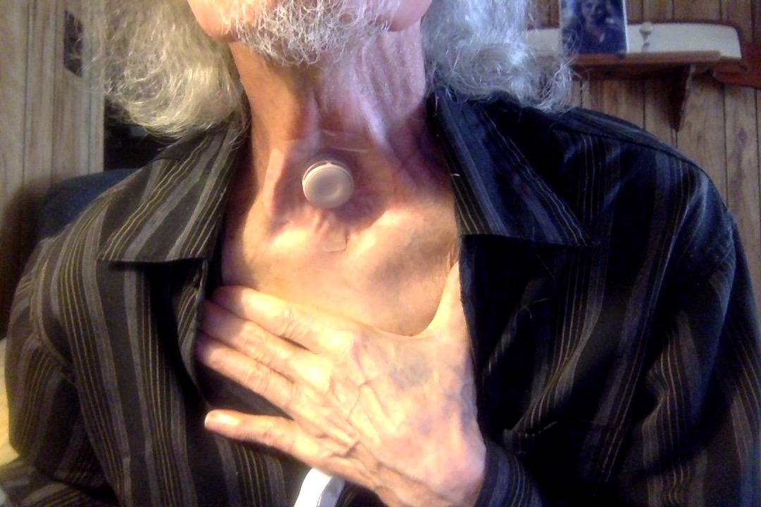 I am in recovery from stage 4 larynx cancer and major surgery which removed my larynx (voicebox) and the base of my tongue which was then rebuilt using a flap of muscle from my left shoulder and an artery from my leg.