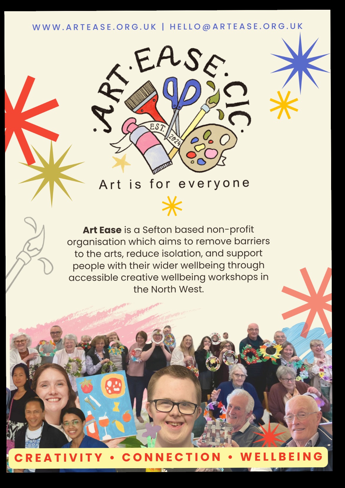 Art Ease CIC is a grassroots, non-profit organisation dedicated to making creative wellbeing accessible to everyone. We run community workshops designed to help people feel more connected, relaxed and supported, particularly those who may be experiencing isolation, low mood or barriers to accessing the arts.
