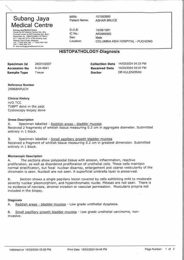 The collected sample appears as “Low Grade Urothelial Carcinoma” which is a bladder cancer. This is a low grade uretheral cancer so this cannot be treated with chemotherapy or radiology.