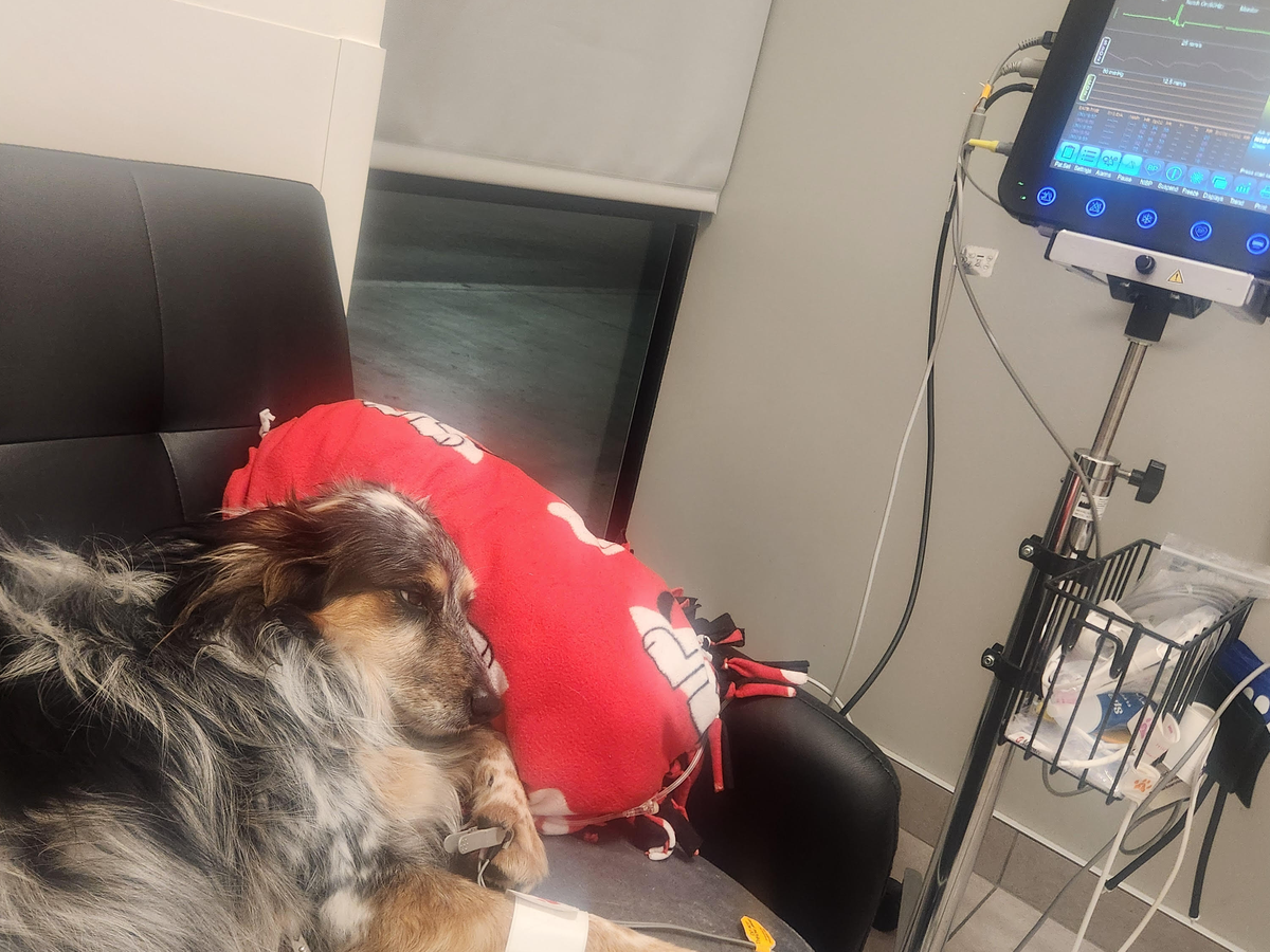 Upon arrival at the animal hospital, Ash was immediately put on oxygen and I.V.'s, as well as a heart monitor. After hours of not being able to diagnose the problem, he was taken into