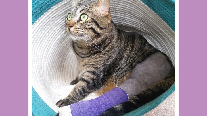 We have spent nearly every minute of each day with Aspen. At most she may have a couple hours of alone time in her 'apartment' which is a large playpen, with her bed and soft blankets and a small kitty tent to hide in. We help her in the litter box, she has a hard time getting into position and will pee all over her good leg if we don't lift up her hind end or scoop litter to help redirect the flow. The first week involved 4 different medications needing to be administered 8 or more times each day. Now she has one medicine twice daily that we can mix into a treat for her.