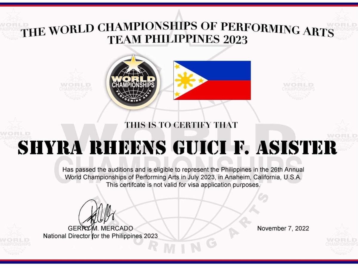 Hi, my name is Shyra Asister and I am 17 years old. It has been my ultimate dream to join a competition that will allow me to showcase my talent to the world. There was an opportunity that took place in my city where I auditioned and is now one of my country's representatives. The final competition will take place in Anaheim, California, yet financial struggles have been an issue for me to move forward in this dream. The Competition I joined is called WCOPA (World Championship of Performing Arts), The Only World Talent Olympic Competition. I hope that fundraising on this platform will help me reach my ultimate dream and allow me to represent my country which is the PHILIPPINES