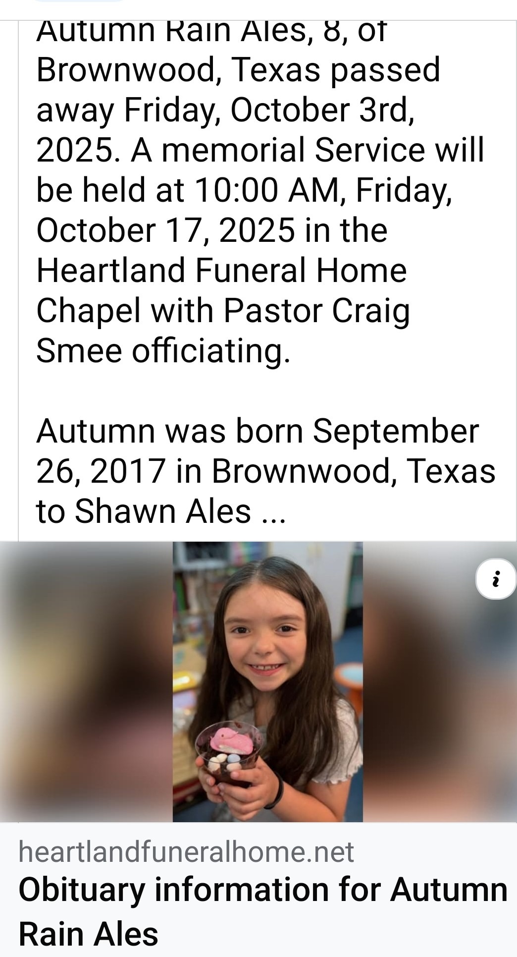 Hello! We are devastated to have lost this beautiful baby girl in a tragic car accident on Friday, Oct. 3rd, 2025. She had just turned 8 years old, was full of life, laughter, joy, and had a personality out of this world. She was the youngest of 6 siblings. The entire family is currently mourning the loss of Autumn Rain Ales. Autumn was my lil cousin. It's almost too much to absorb. Unfortunately, their only car was completely destroyed in the accident, with only liability insurance. A total loss. They will need a form of transportation to travel to work, take the 5 children to school, go to Dr. appointments, grocery store, etc. With a family as large as this, there's no room for saving. There's nothing put back for a rainy day or for emergency situations. This family is in serious need of assistance in getting a new form of transportation. Would you help a family in need? Would you also take a moment to pray for this family who are broken-hearted and mourning the loss of a beautiful soul? I would like to thank everyone who helps my cousins in this challenging and upsetting time! God Bless You All!