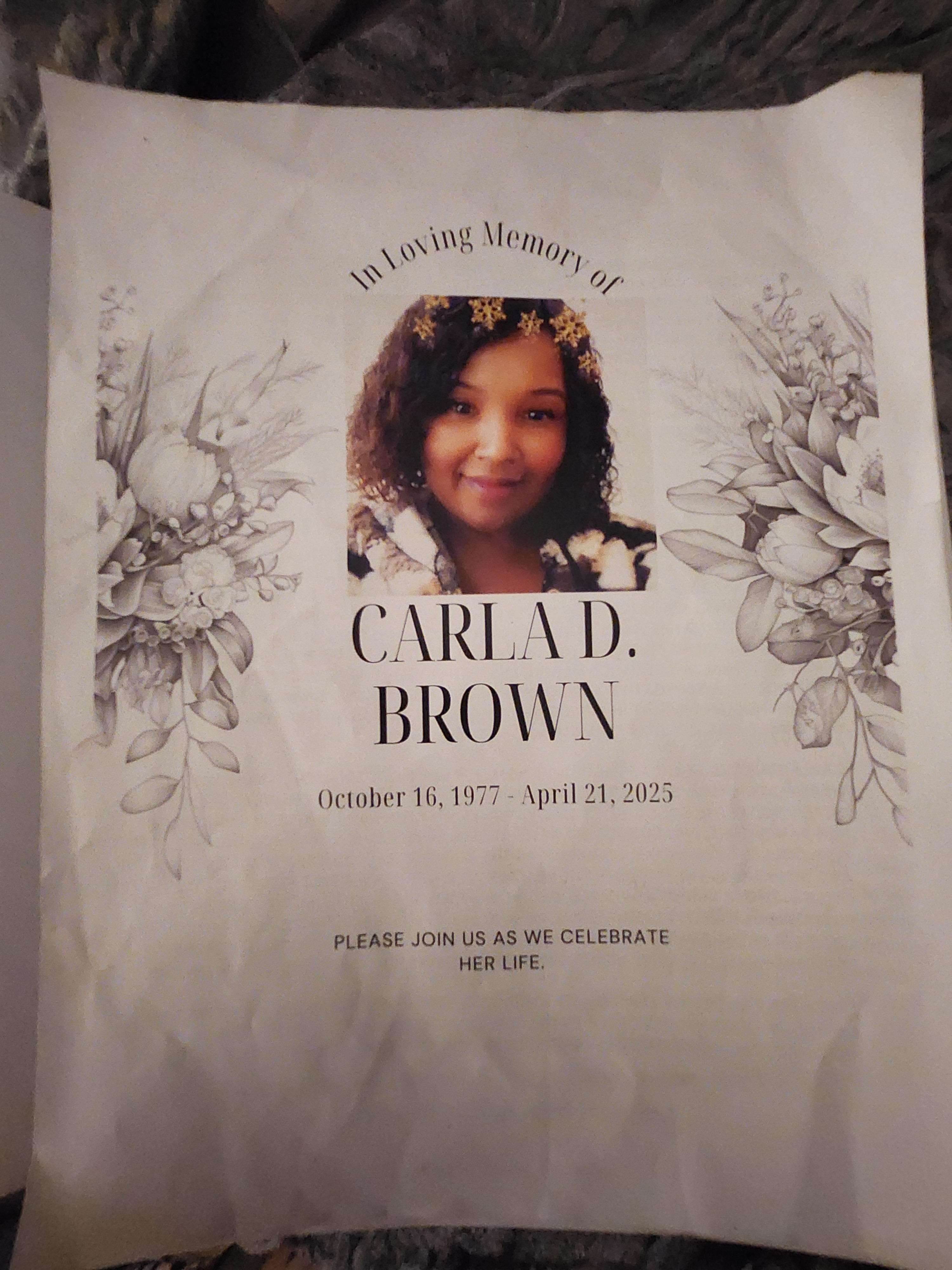Hello, my name is Crystal and for the past year I had the honor of caring for my Aunt Carla, allowing her to live with me and my family in our humble home. She had been sickly for some time and sadly, just before her 48th birthday, she passed away leaving two beautiful grandchildren whom she loved very much.