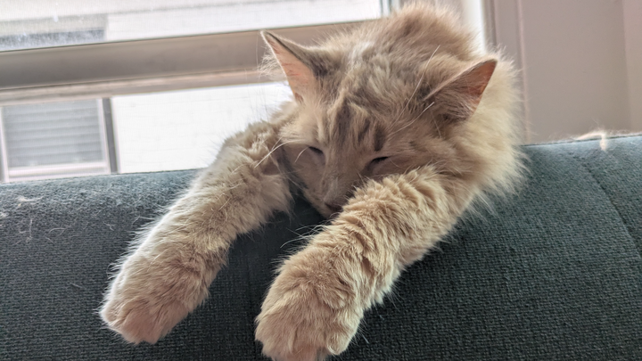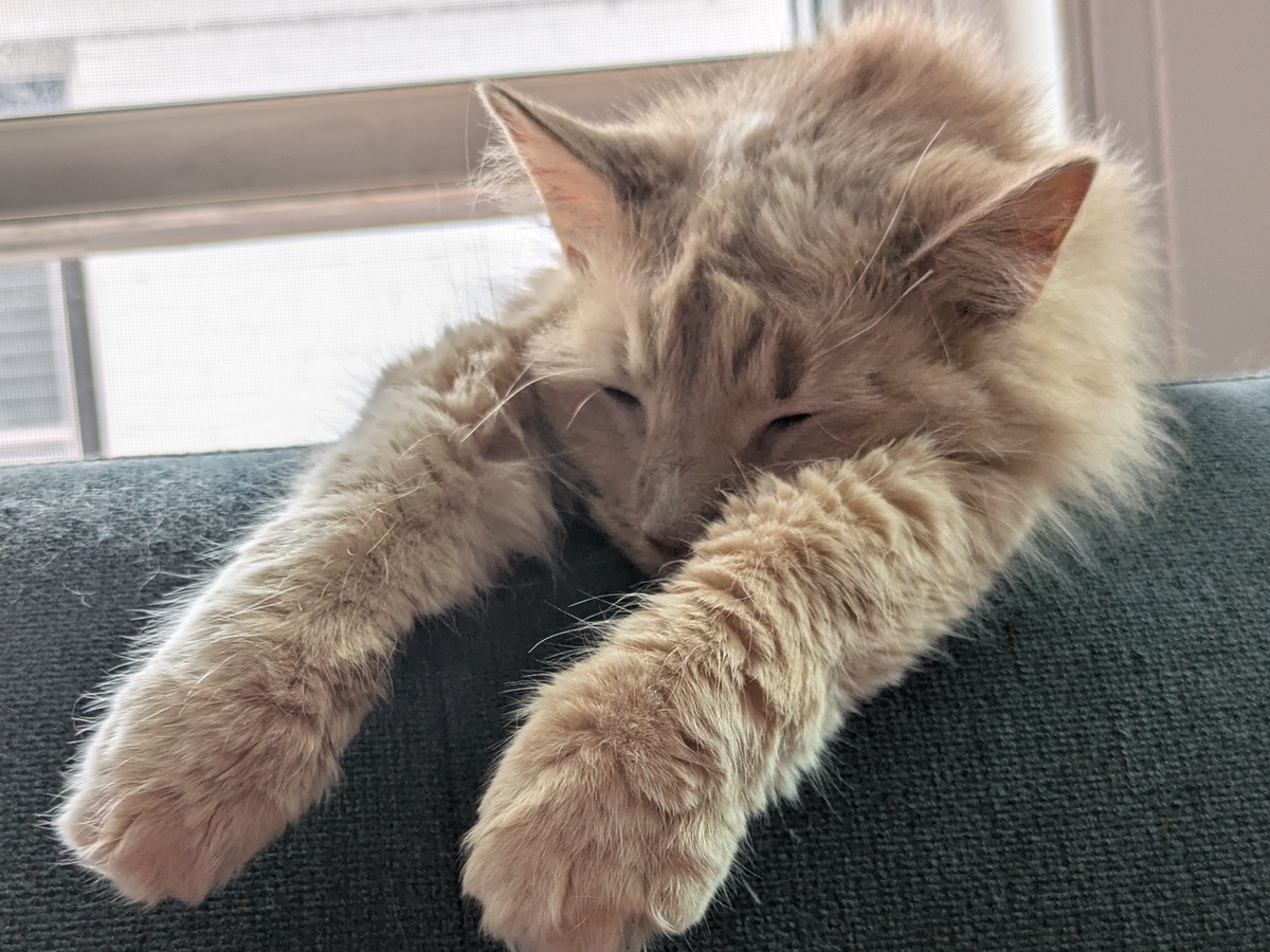 Today, when I got home, I found her body behind my couch, and her head was stuck between my couch and my windowsill. She had gotten her head stuck between my couch and my windowsill while I was away for the evening last night.