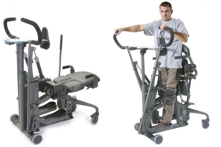 This is the standing frame (but that is not Joel) that is critical to Joel's continued progress. It is a special exercise machine with additional features to support Joel’s rehabilitation and ongoing health maintenance. It has handles similar to an elliptical exercise machine that can be used for cardiovascular exercise and for upper-body strengthening. The handles also have connections to the legs so that the movement of the handles simultaneously move the legs to maintain range of motion in the ankles, knees and hips.