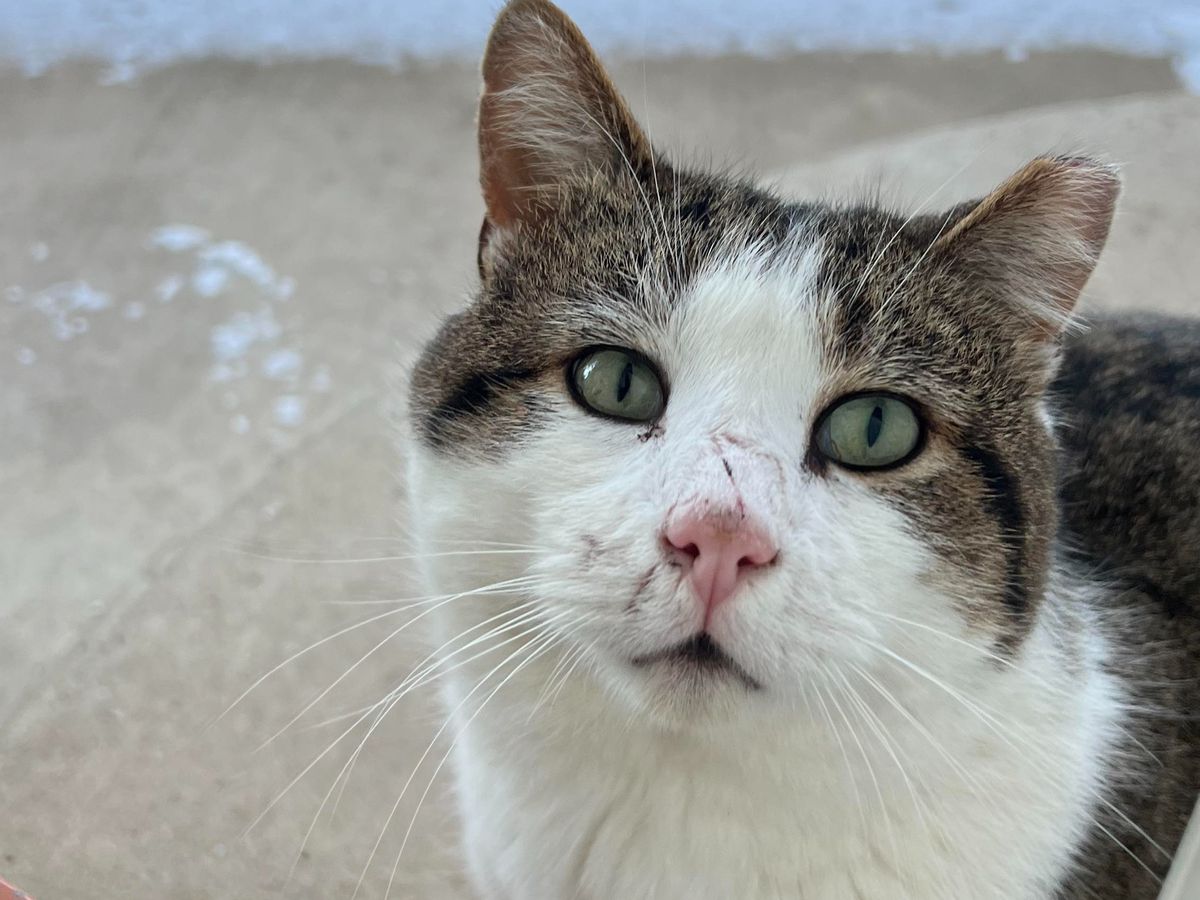 He’s an elderly cat with broken teeth, fractured toes, and battle scars. He also has feline leukemia.