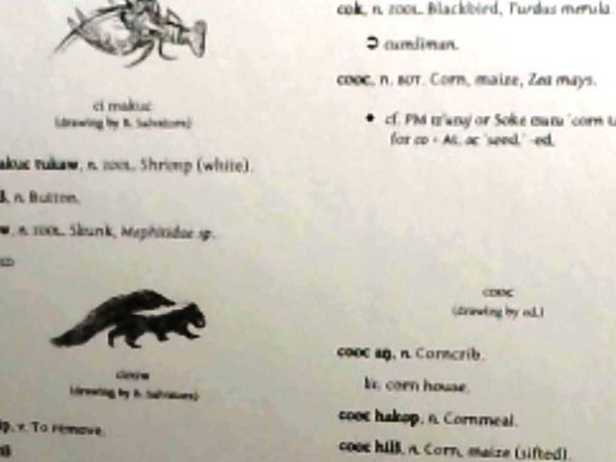 I will let Justin speak for the details of what he is still working on with the Grammar, but as for the Dictionary, my part of the book, I continue adding vocabulary items, some of which are well hidden in the forest of Swanton’s (1932) long, meandering entries. I’m also adding example sentences to various entries, adding cultural information where it is known, cross-referencing vocabulary items for ease of look-up, and, perhaps most importantly, undertaking the tedious task of inserting Swanton’s page number to each entry of my Dictionary so that one can easily find Swanton’s original entry in the original 1932 dictionary. Also, I will add appendices for numbers, plant and animal names, kinship terms, etc., that will allow you to easily look these up without searching the whole Dictionary. (These sections can also easily be copied for use in a classroom or for the individual learner.)