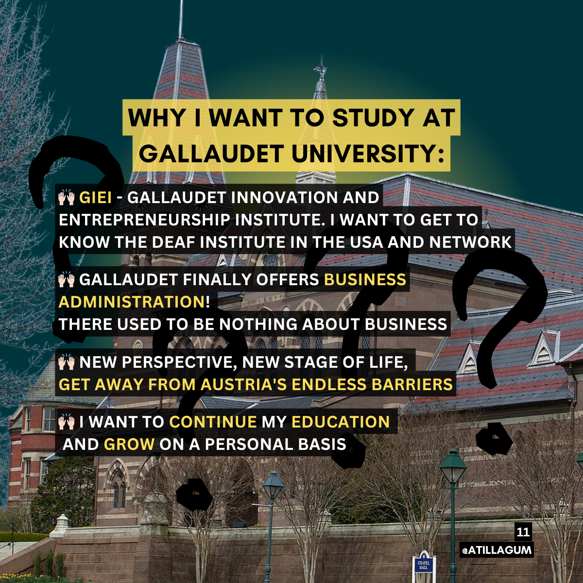 Im Jahr 2024 traf ich in Wien eine Studentin der Gallaudet University. Diese hat ihren Standort in den USA und ist die einzige Universität weltweit, an der gehörlose Menschen in Gebärdensprache studieren. Gallaudet ist ein Ort, an dem sich Kultur, Sprache, Bildung und Entwicklung vereinen. Für mich: ein Ort, an dem ich mich zuhause fühlen könnte. Besonders begeistert mich das GIEI (Gallaudet Innovation & Entrepreneurship Institute), wo gehörlose Studierende auf Mentor*innen aufeinandertreffen und lernen, ein eigenes Unternehmen zu entwickeln.
