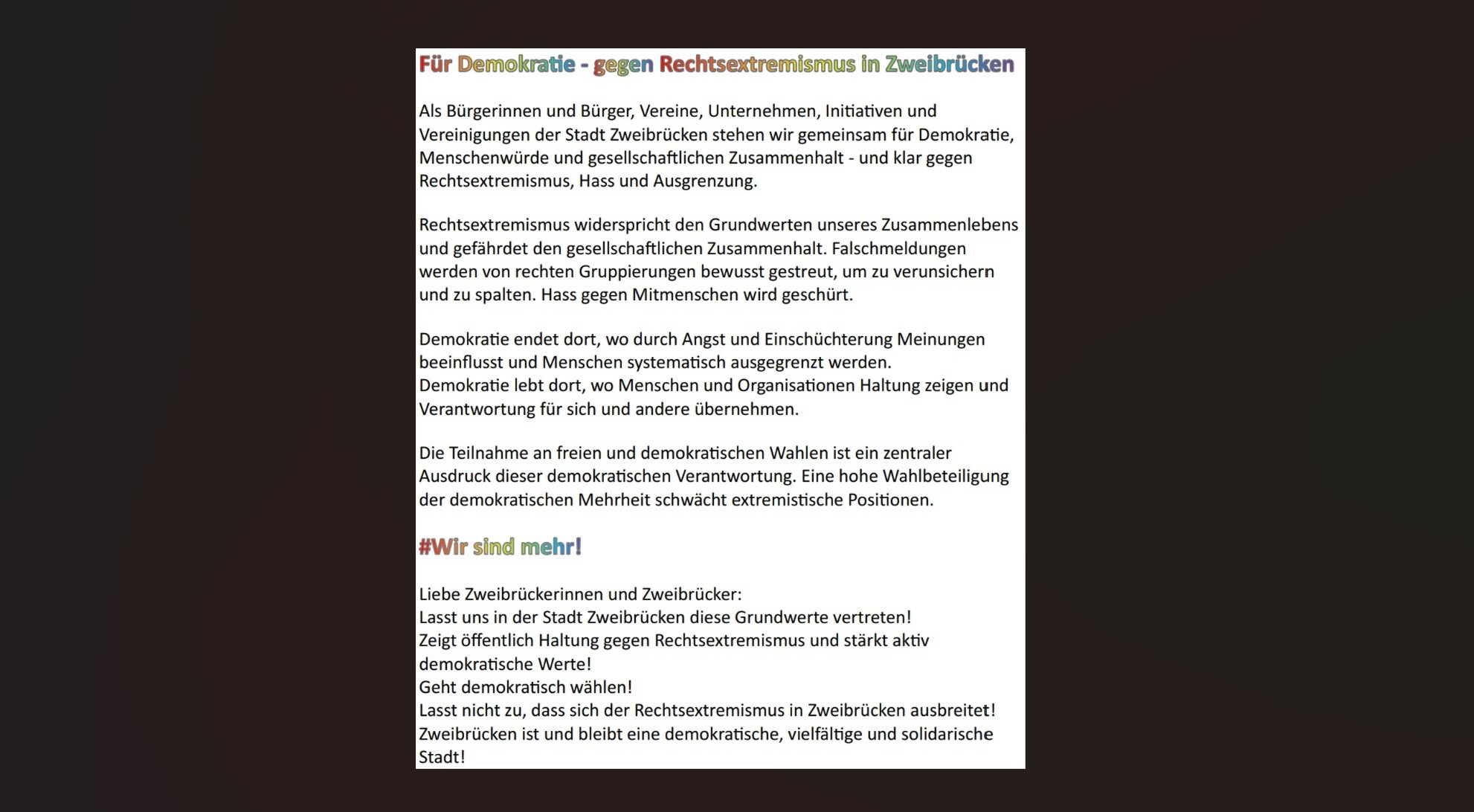 Deshalb wollen wir vor der Wahl am 22.3.26 ein Zeichen setzen und haben einen Text verfasst, den mittlerweile über 50 Organisationen, Unternehmen, Praxen, Parteien und Vereine unterzeichnet haben. Dieser wird in den lokalen Zeitungen veröffentlicht werden.