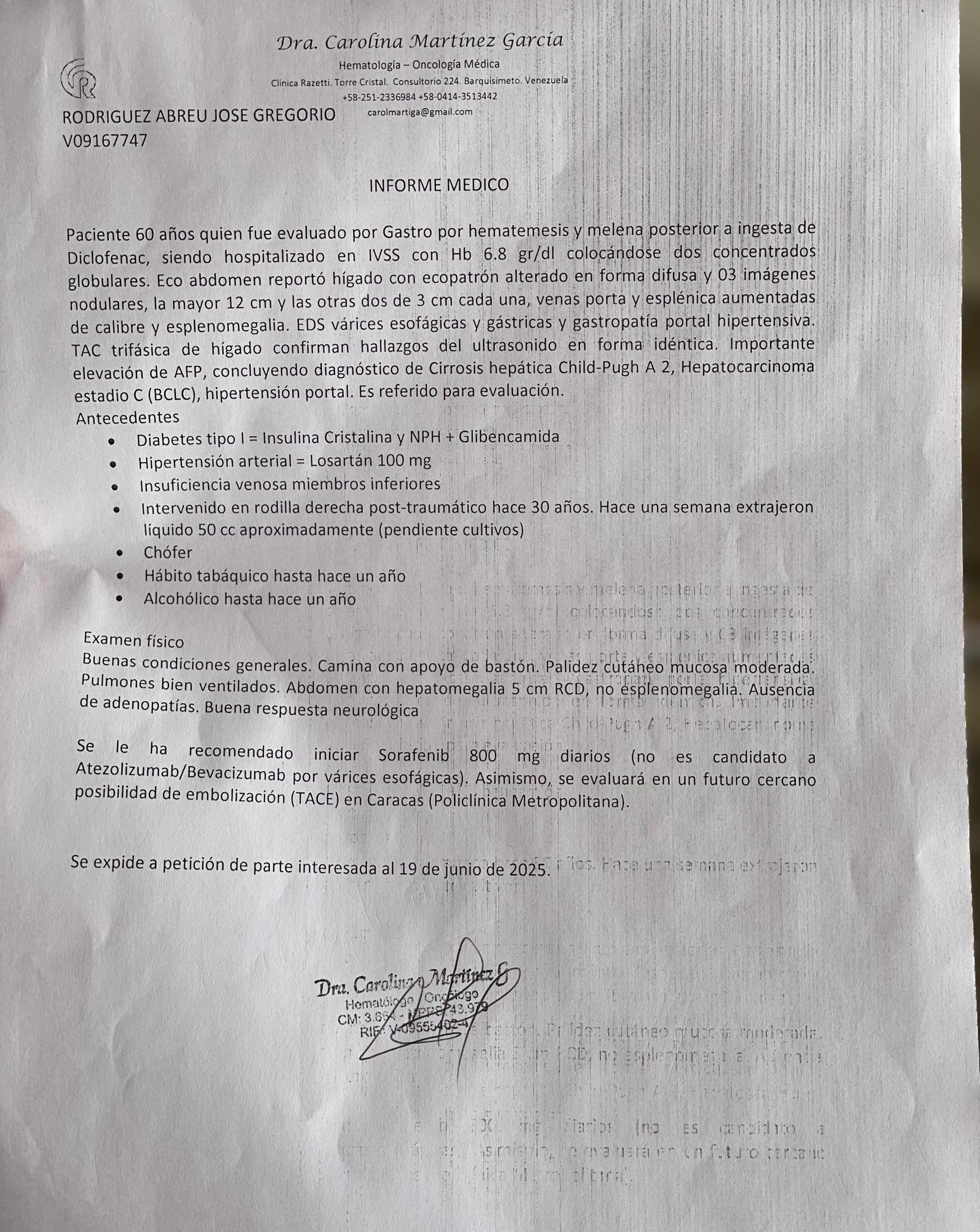Con el corazón en la mano, acudimos a ti para pedir tu apoyo para nuestro querido tío, José Gregorio Rodríguez, quien ha sido diagnosticado con hepatocarcinoma en estadio C, además de padecer cirrosis hepática Child-Pugh A2 e hipertensión portal.