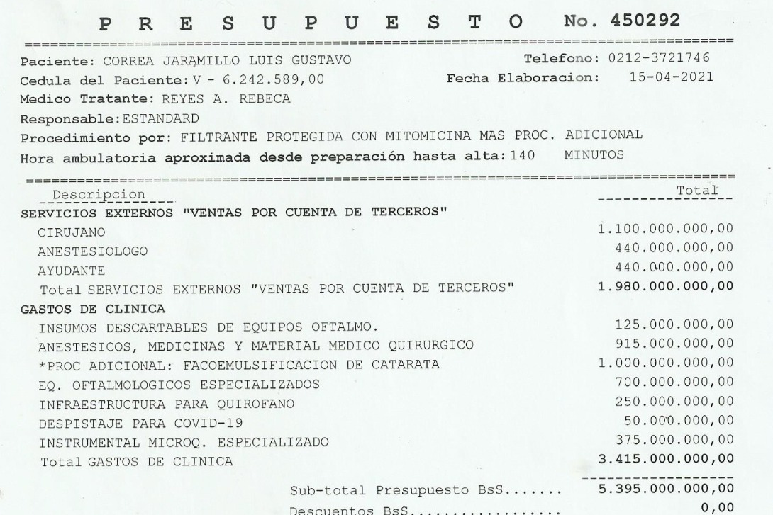 Al cambio vigente para el día 19 de abril, el costo de la intervención $2.158dólares más el costo del lente $120 dólares, por lo tanto, el monto que Gustavo debe pagar en dólares es de $2.278,00, Intervención que debe realizarse a la brevedad para impedir el avance de su pérdida de visión, aunado al hecho de que es necesario realizarle exámenes preoperatorios y suministrarle medicamentos ,