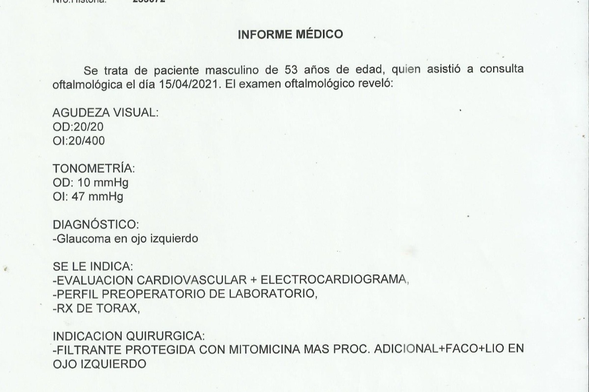 El está padeciendo un glaucoma agudo en el ojo izquierdo que lo ha llevado a perder la visión en más de un 75%, con riesgo de que el problema aumente mientras no se opere, y el agravante de que el problema que se lo suscitó puede afectarle el ojo sano en cualquier momento.