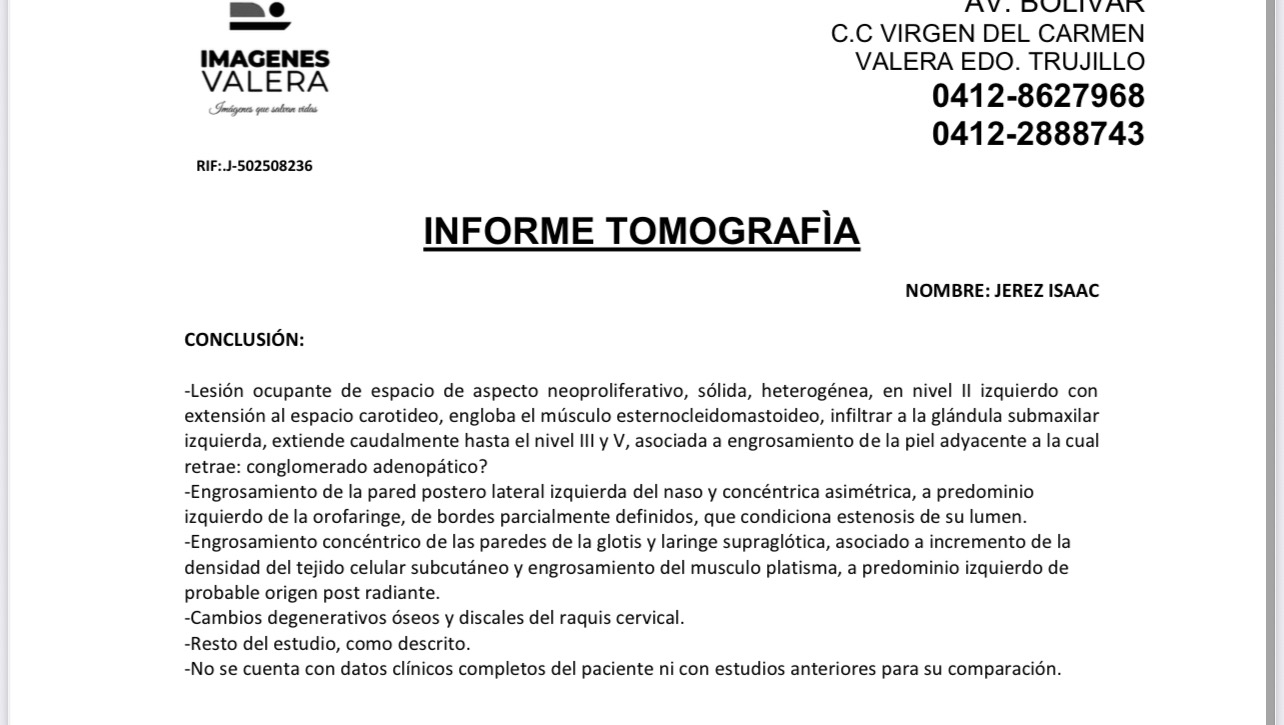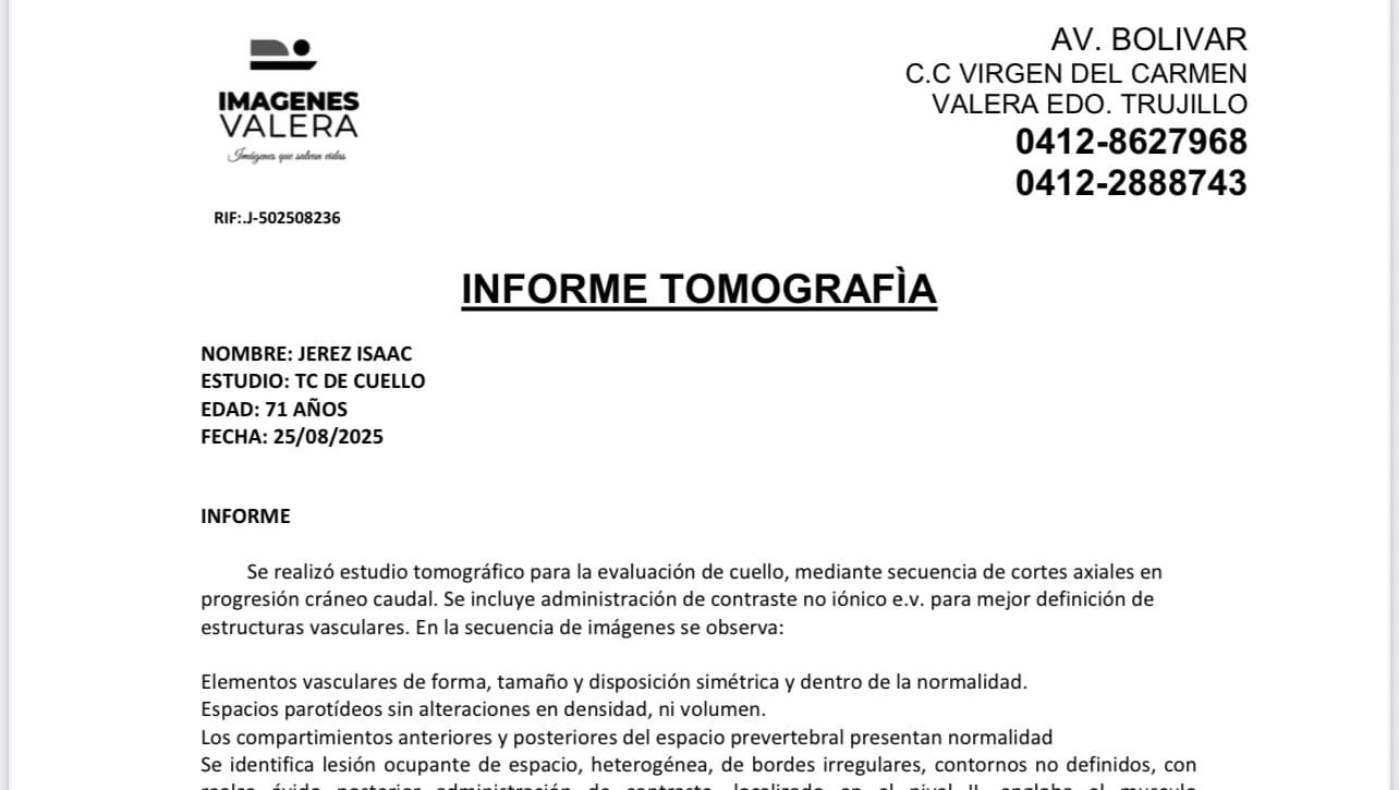 My name is Maria Alejandra Jerez, and today I am asking for help for my father, who is battling a recurrence of laryngeal cancer. In 2021, he was diagnosed with metastatic squamous cell carcinoma, and after initial treatment, he is now facing this difficult disease again, but now with an infiltrating tumor. A few weeks ago, my father had to undergo a tracheostomy and gastrostomy, and shortly afterward, he suffered a severe infection with hospital-acquired bacteria that nearly led to sepsis. He managed to survive thanks to the care he received, but his condition remains very serious. Current Medical Status Recent imaging studies show: A solid, heterogeneous tumor lesion in the neck (level II on the left) infiltrating muscles and the submandibular gland, extending to levels III and V. Thickening of the glottis and supraglottic larynx, with narrowing of the lumen, compromising his breathing. Thickening of soft tissue and muscles, partly due to the effects of previous treatments. This confirms that the cancer is advanced and relapsed, affecting critical structures in the neck. Urgent treatment needed To continue fighting, my father must: Receive continuous infusion chemotherapy for six days while hospitalized. Then undergo highly complex head and neck surgery, which cannot be performed in Trujillo state because there is no specialist surgeon there. Receive daily nursing care, as his tracheostomy wound has not yet healed and requires cleaning, monitoring, and constant care. Why are we asking for help? The costs of the tracheostomy and gastrostomy surgeries, along with hospitalization for the bacterial infection, have almost completely depleted our family's savings. Added to this is the fact that my father lives in Venezuela, where the country's conditions make medical care even more complex and expensive, with limited specialists, hospital infrastructure, and access to treatment. Currently, we do not have the necessary resources to cover: Hospitalization in a secure facility. Specialized chemotherapy. Transfer and surgery out of state. Private nursing care and medication. Every day counts. Without this treatment and care, his life is at risk. How you can help Any contribution, no matter how small, will be one step closer to giving my dad the chance to continue living. It also helps us a lot if you share this campaign with your friends and family. From the bottom of our hearts, thank you for your solidarity and for joining us in this difficult fight.