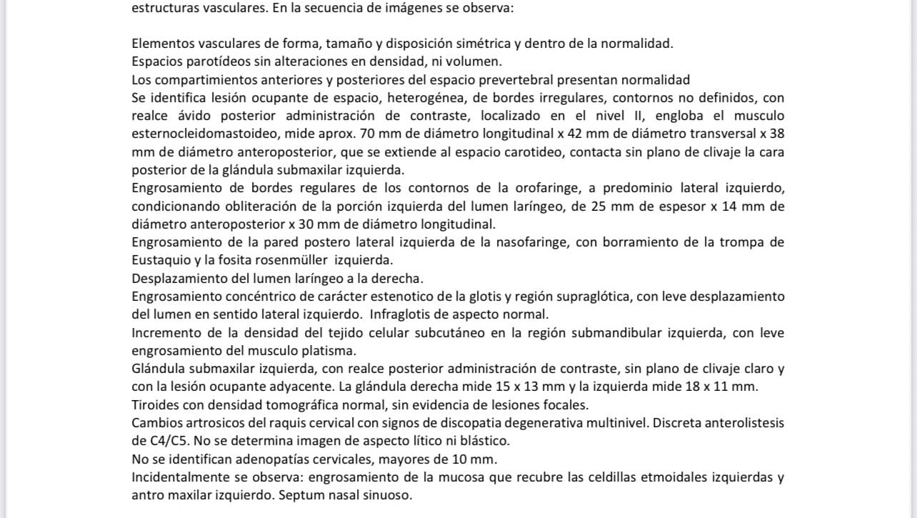 Lesión tumoral sólida y heterogénea en el cuello (nivel II izquierdo) que infiltra músculos, glándula submaxilar y se extiende a niveles III y V.