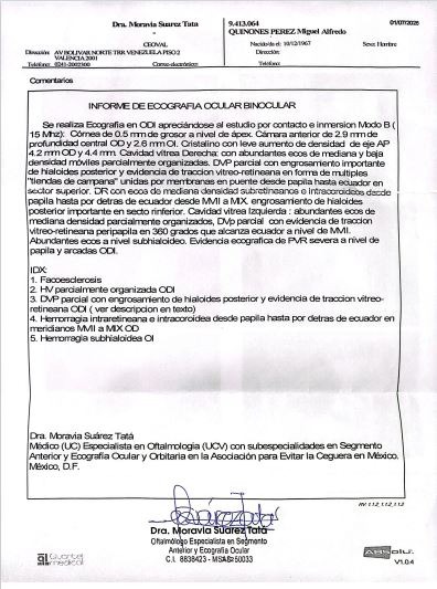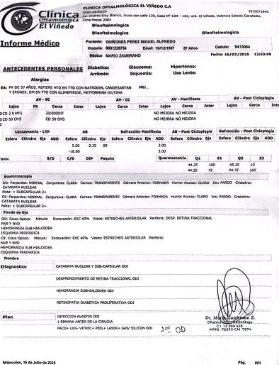 El Dr. Mario Zambrano, me ha dicho que tengo varias condiciones serias, como cataratas (nucleares y subcapsulares en ambos ojos) , y una condición llamada retinopatía diabética proliferativa. Todo esto ha afectado gravemente mi vista. La buena noticia es que estoy a tiempo de poder recuperar la visión de al menos un solo ojo, si está en tu alcance ayudarme a recuperarla.