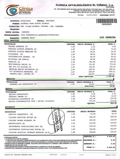La cirugía principal para mi ojo derecho tiene un presupuesto de $3,910.00 USD.