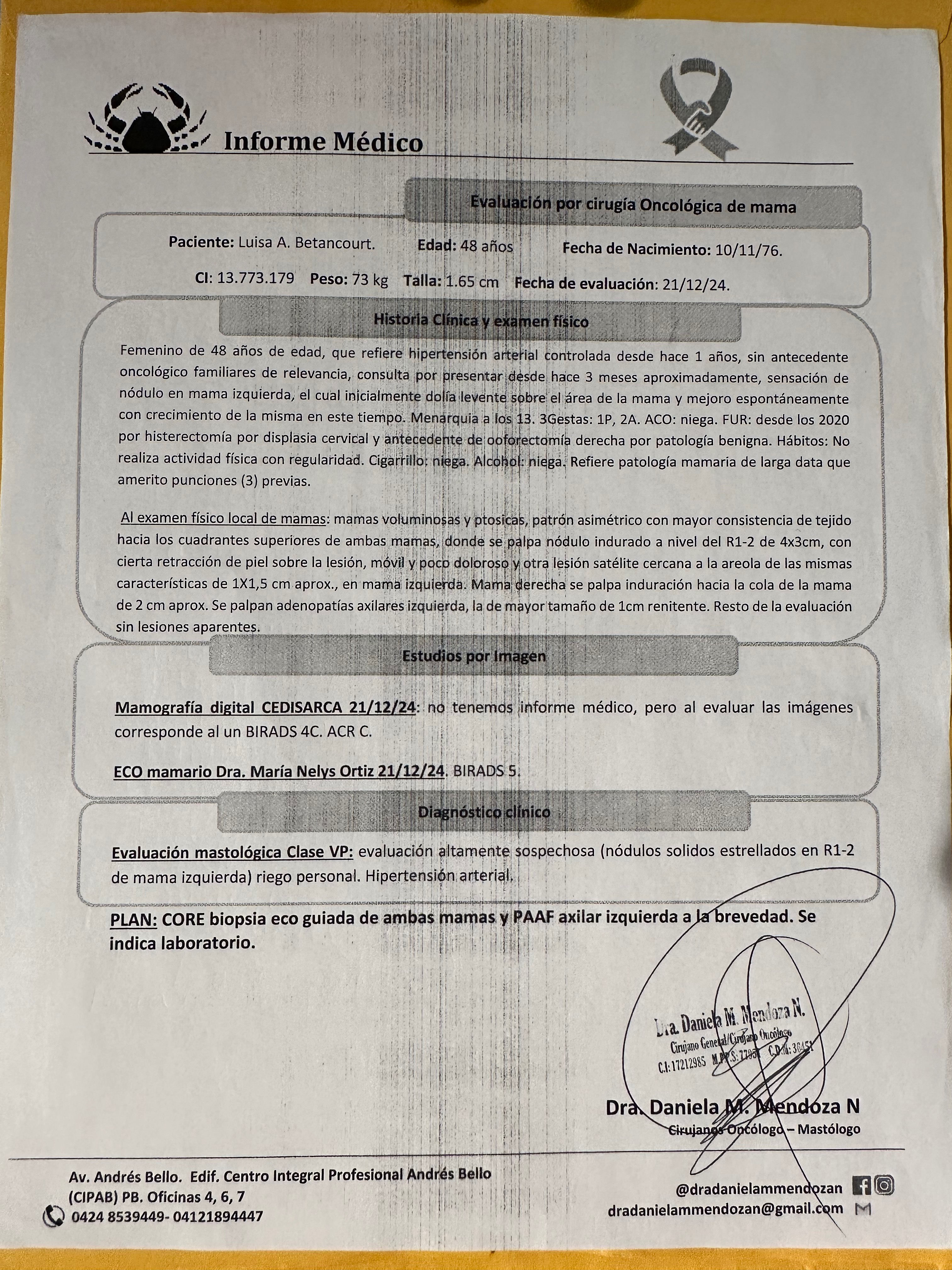 Tras completar mis ciclos de tratamiento, yo Luisa Betancourt he recibido la noticia de operarme para realizarme una mastectomía radical. La cirugía es urgente, pero los recursos económicos son escasos. Con el corazón afligido decidí entrar a esta comunidad del gofoundme no solo para solicitar ayuda, sino para compartir mi historia y mi lucha con gran vulnerabilidad espero que está situación de la vuelta al mundo entero para poder recolectar el dinero esperado y con la gran convicción de que seré operada lo antes posible , pero también con mucha fortaleza de espíritu que me permite continuar esta lucha hasta el final.