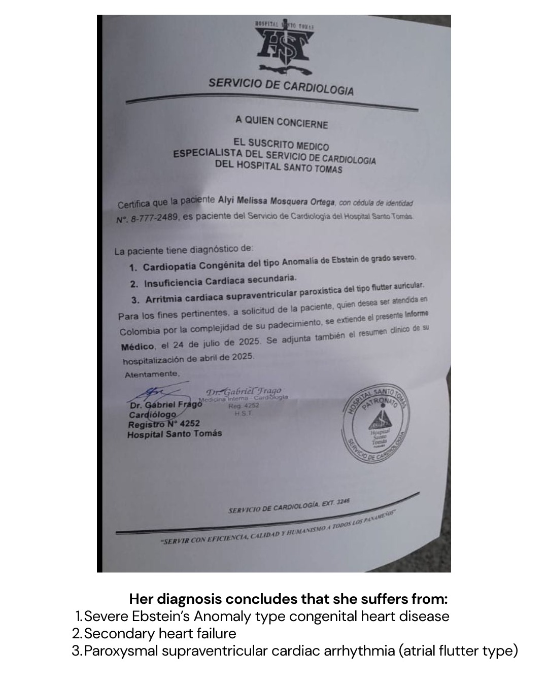Después de muchas consultas y búsquedas, hemos encontrado en Colombia a un doctor especialista en su condición, quien puede realizar la operación que necesita con urgencia: bloqueo de arritmias, cateterismo y reemplazo de la válvula tricúspide. Este procedimiento es vital para mejorar su calidad de vida y darle la oportunidad de seguir luchando por ella y por su bebe de 1 año...