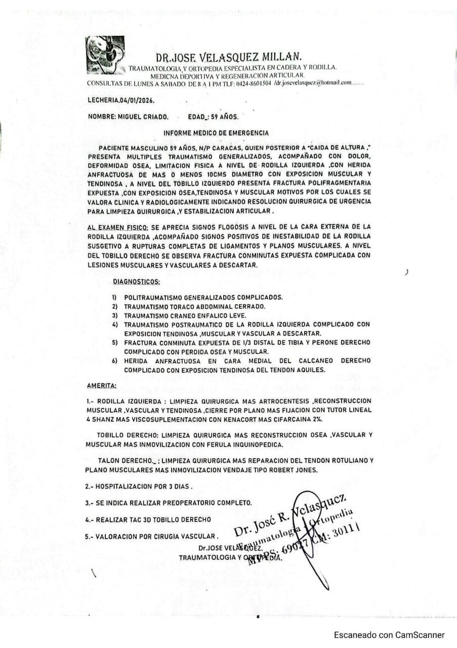 En la mañana del 4 de enero del 2026, me encontraba con mis papás vacacionando en el Estado Anzoátegui. Mi papá se dirigió al balcón a ver el paisaje, cuando la estructura que no estaba soldada de un extremo colapsó, provocando su caída al vacío. En cuestión de segundos nos asomamos y mi papá estaba agonizando del dolor, con el pie derecho completamente roto y separado de la pierna, sangrando a su vez de la pierna izquierda sin parar. El balcón no se encontraba en óptimas condiciones, generando laceraciones en los glúteos y múltiples fracturas en las piernas de mi papá Miguel Angel Criado González.