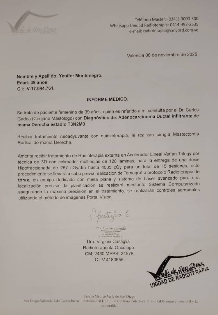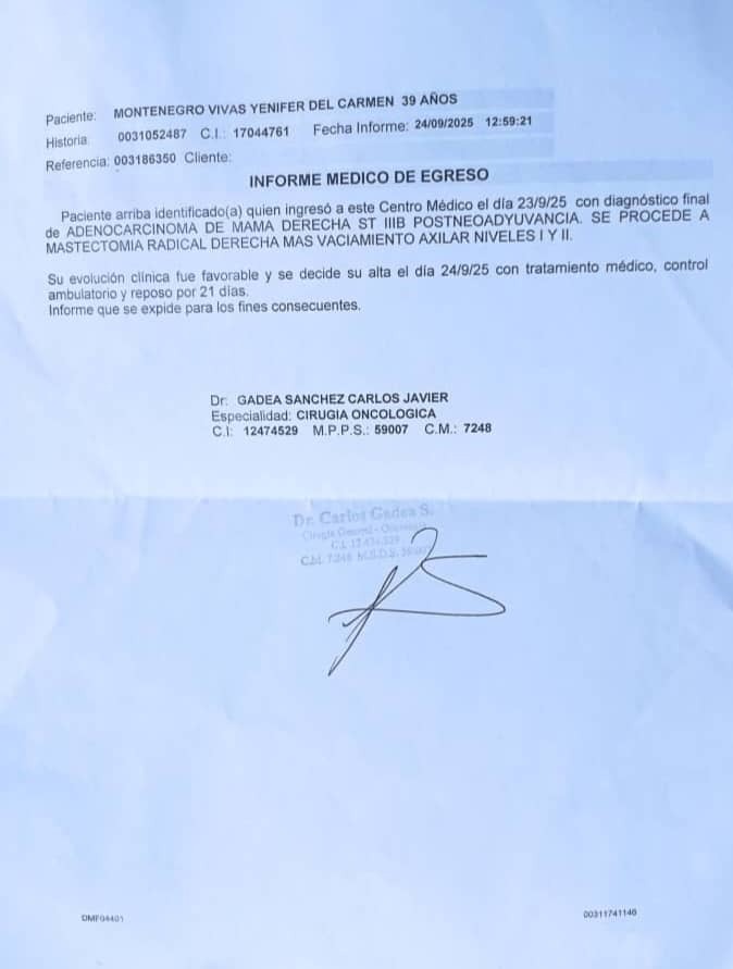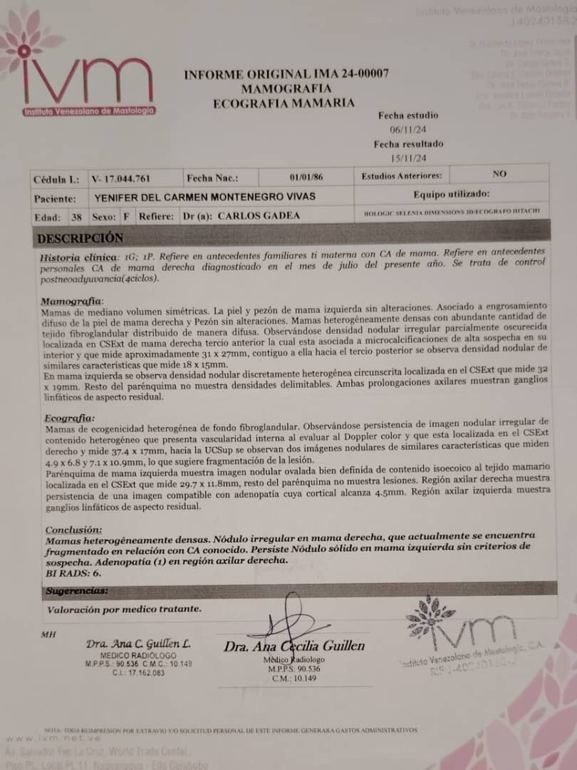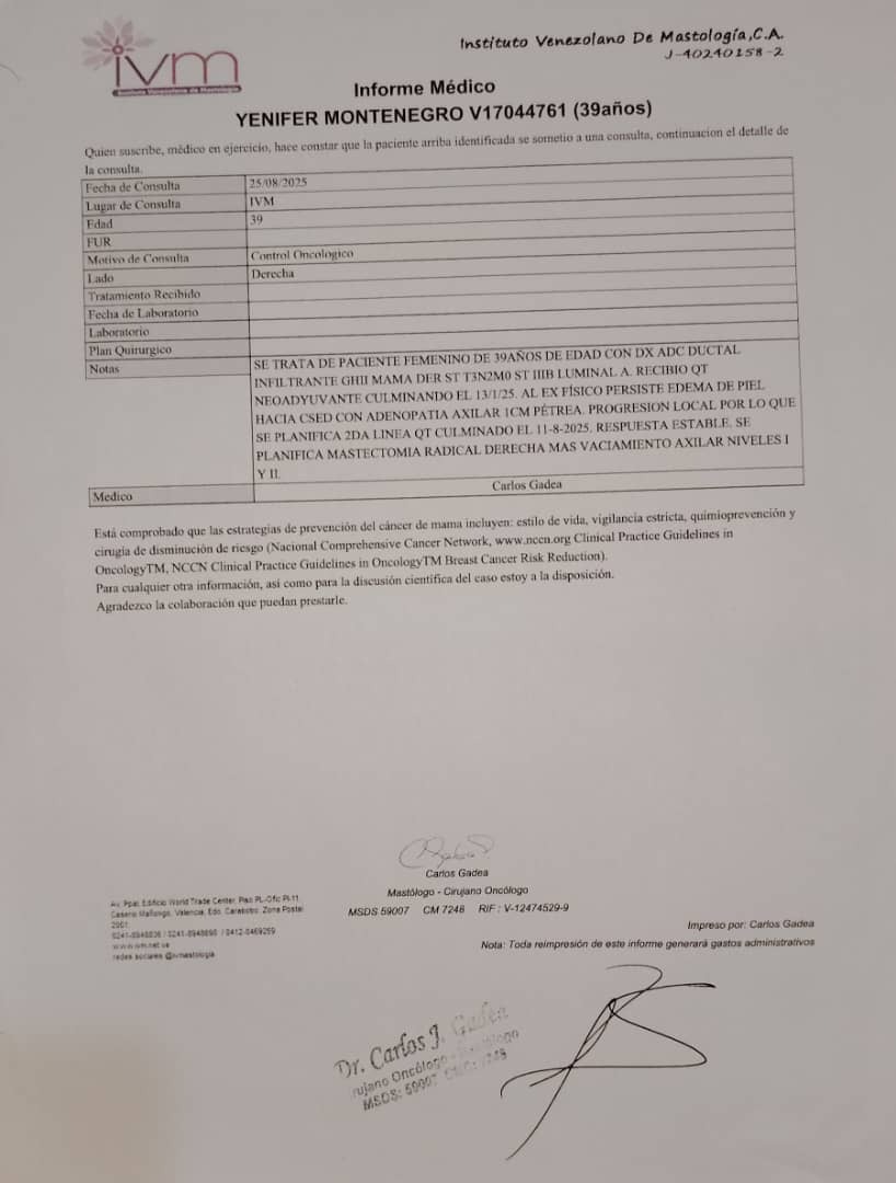 I am writing to you with a special request for help for my cousin Yenifer Montenegro Vivas, a brave 39-year-old mother who is facing a battle against breast cancer and urgently requires a total oncological mastectomy surgery + VAC. Axillary plus Adenomas + Reconstruction + Flap + Breast Implant This operation is vital in her treatment and recovery, but unfortunately, the associated costs are beyond her reach at this difficult time. We have the medical report and operation budget on hand for anyone who wants to see it if they wish to collaborate with this cause.