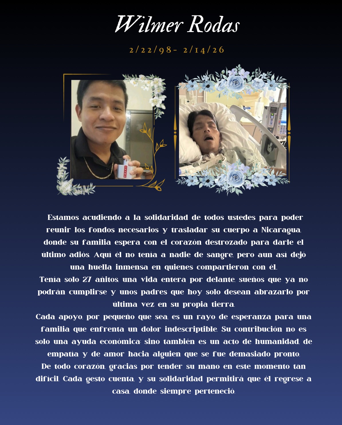 Wilmer no cuenta con familiares en Estados Unidos. Su familia, devastada por esta irreparable pérdida, solicita apoyo económico urgente para poder repatriar su cuerpo a su país de origen y darle cristiana sepultura junto a sus seres queridos.