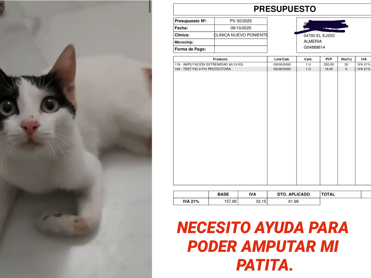Hola, soy Charo la rescatadora de Vela, apareció en medio de una calle muy peligrosa, pidiendo comida, tiene la patita en mal estado, tras llevarla al veterinario, urge amputar su patita, por eso pido ayuda para poder hacerlo cuánto antes. Cada donación cuenta para ayudar a Vela con tan solo 6 meses hay que ayudarla.