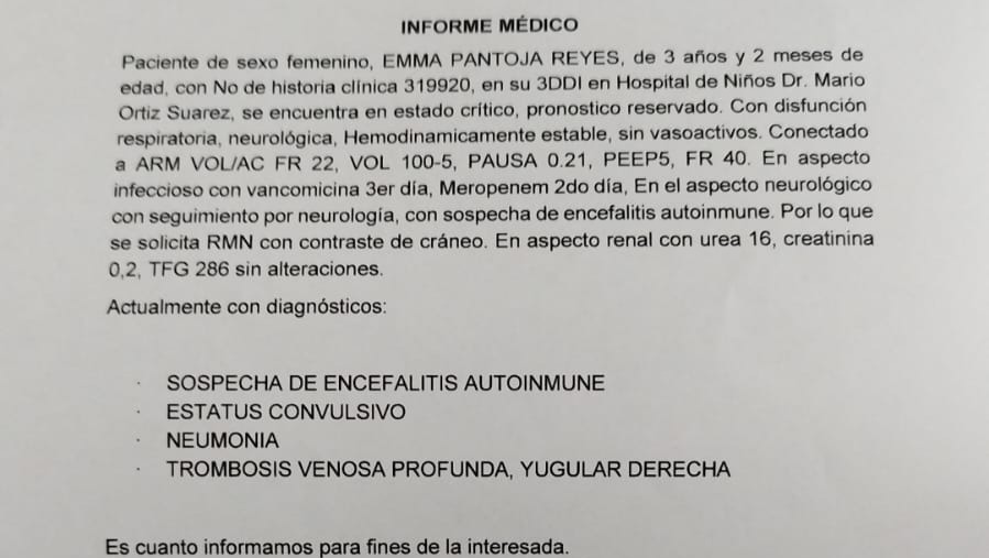Hello everyone, my name Freddy Sebastián Pantoja Hurtado, I am from Bolivia, the funds I want to raise are for my 3-year-old girl, his name is Emma Aranxta Pantoja Reyes she is in intensive care, intubated in critical condition with a reserved prognosis, possibly she has Autoimmune Encephalitis, it is a disease that requires many studies and laboratory analyzes and that are quite expensive, also the treatment of this disease is very expensive since it uses immunoglobulins that cost between $2,000 to $3,000 (dollars), all the proceeds will be used for the purchase of medication, carry out the studies and hospital stay.
