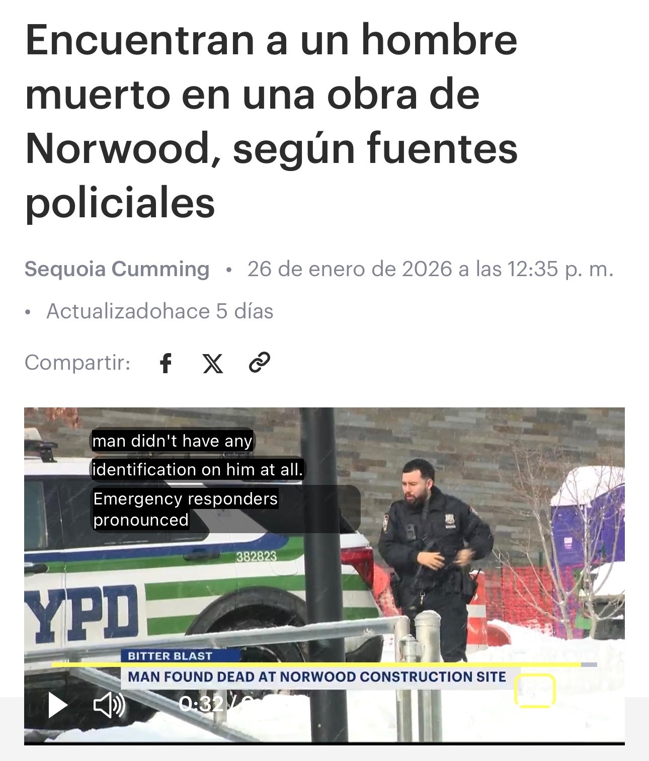 El día 26 de enero de 2026, según fuentes policiales, fue encontrado un hombre sin vida en una obra de construcción en Norwood, en la ciudad de Nueva York, condado del Bronx. El cuerpo fue hallado por un trabajador de dicha construcción, quien dio aviso inmediato a las autoridades.