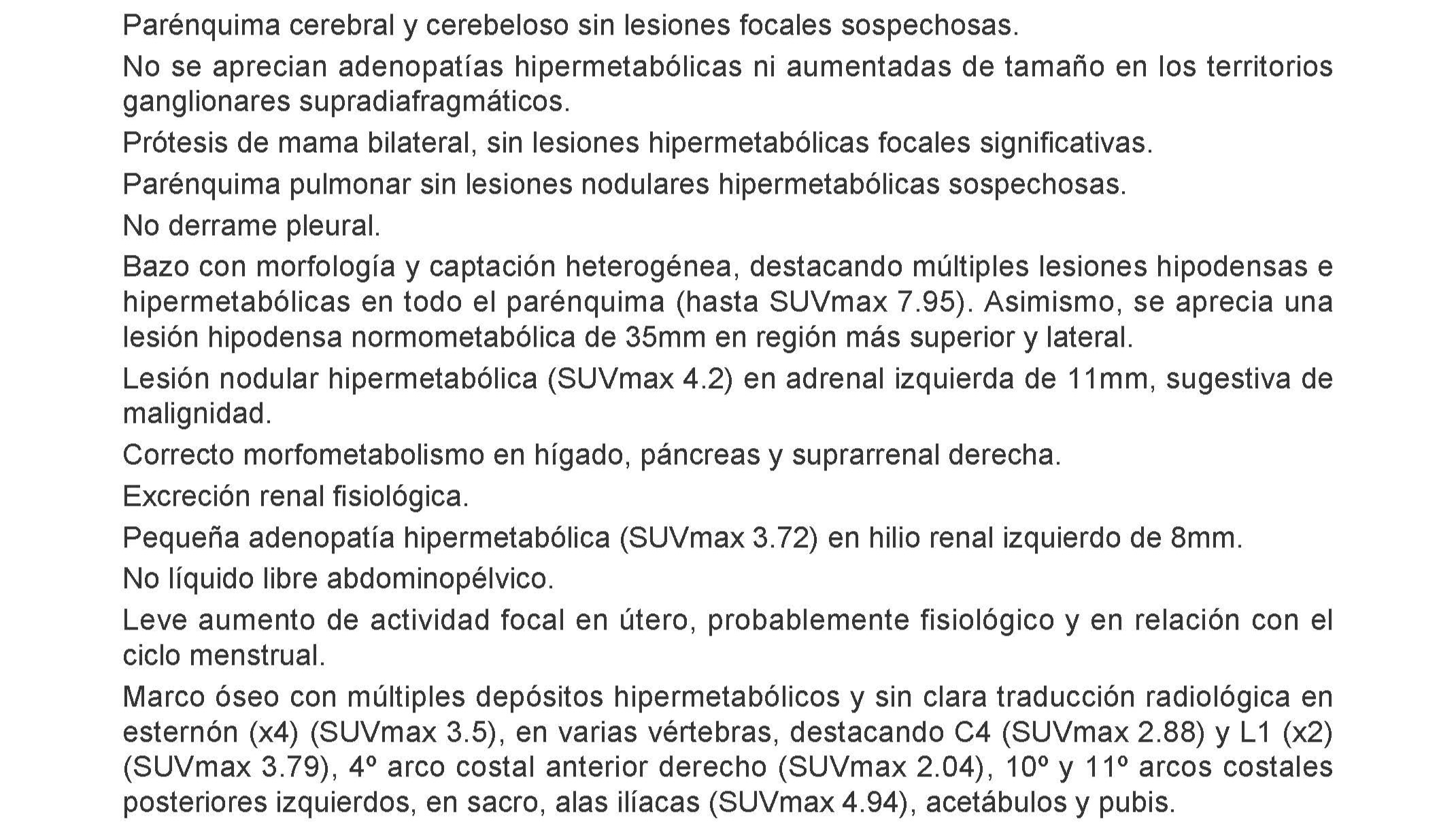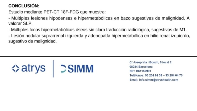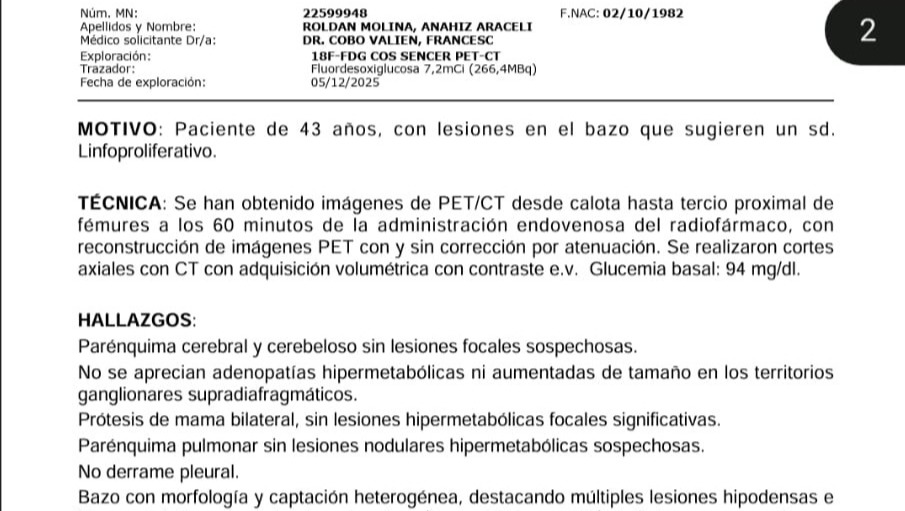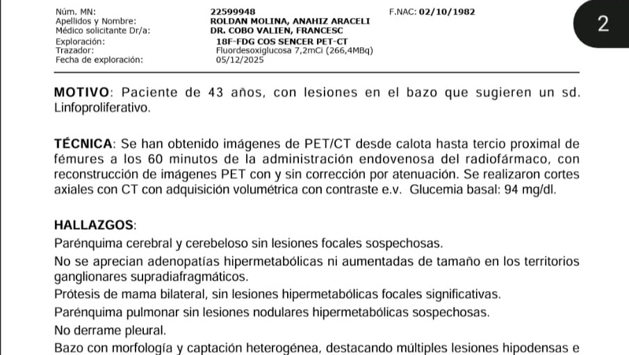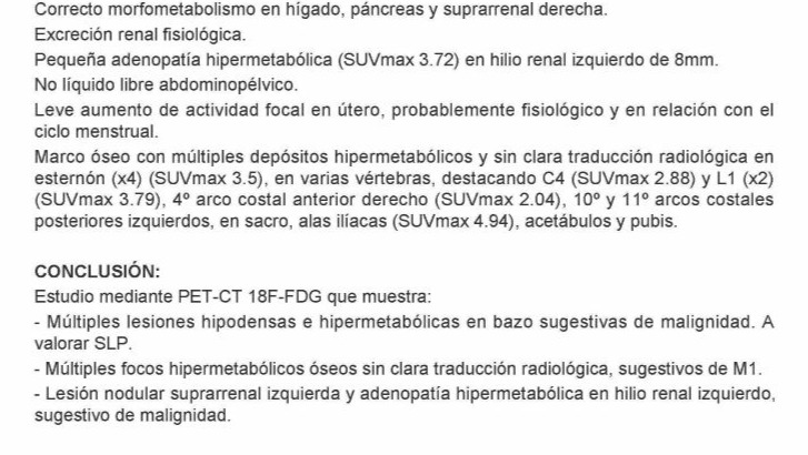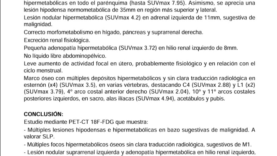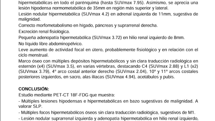 Mi mundo se vino abajo cuando una tomografía, (PET-TAC) confirmó metástasis ósea, sospecha de linfoma en el bazo y malignidad en las glándulas suprarrenales. Luchar contra tres marcadores de cáncer simultáneos es un desafío que los médicos describen como raro y complejo.