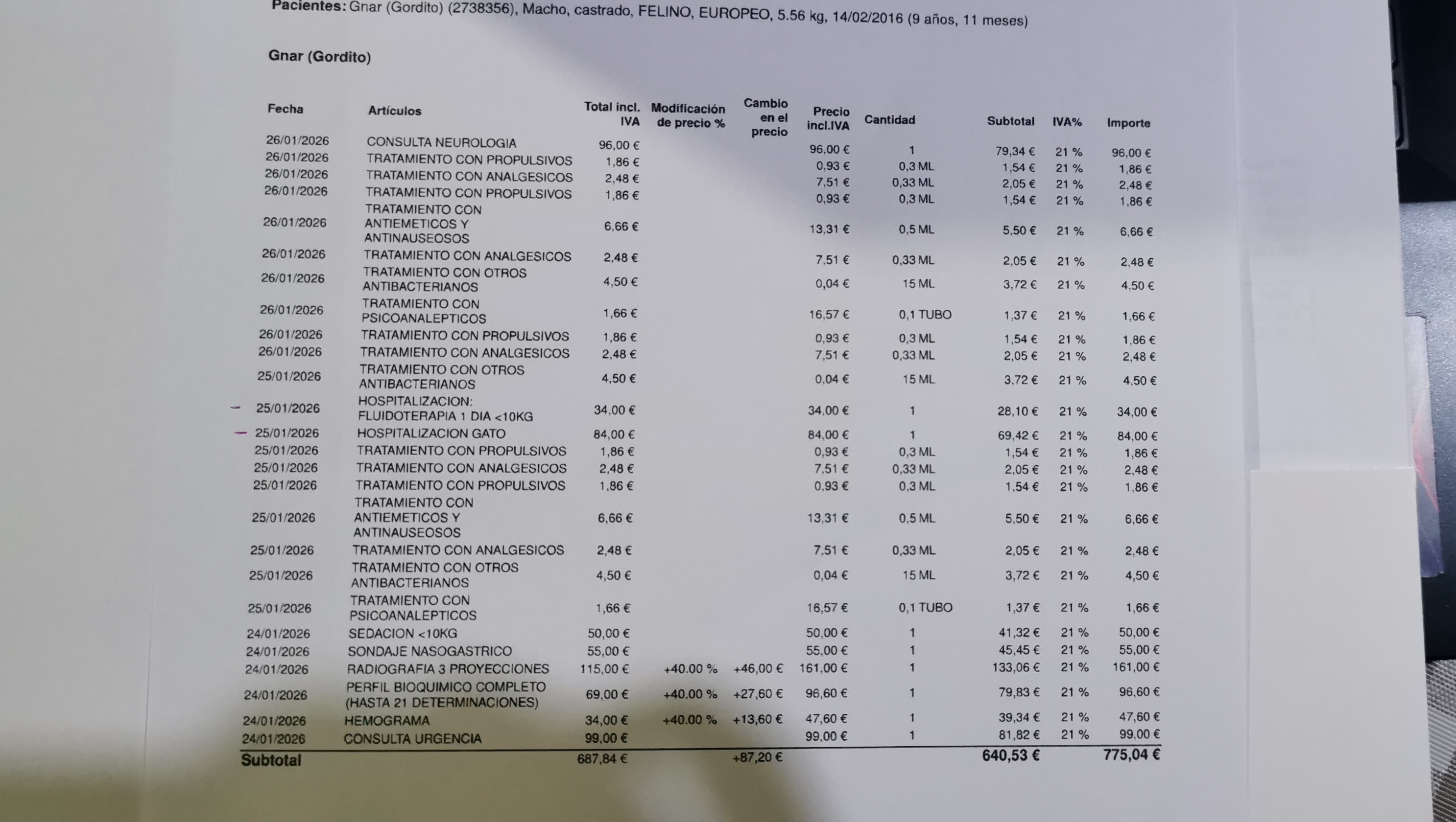 Hospital Vet, hospitalización + sonda + analiticas - 24/01/2026 - 739,10€